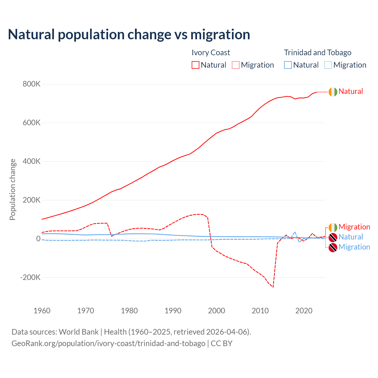 Over the last 10 years, 99.7% of the population change in Ivory Coast is from natural causes (a gain of 7,348,944 people) and 0.33% is from migration (a gain of 24,432 people). In Trinidad and Tobago 66% is from natural causes (a gain of 55,887 people) and 34% is from migration (a gain of 28,785 people).