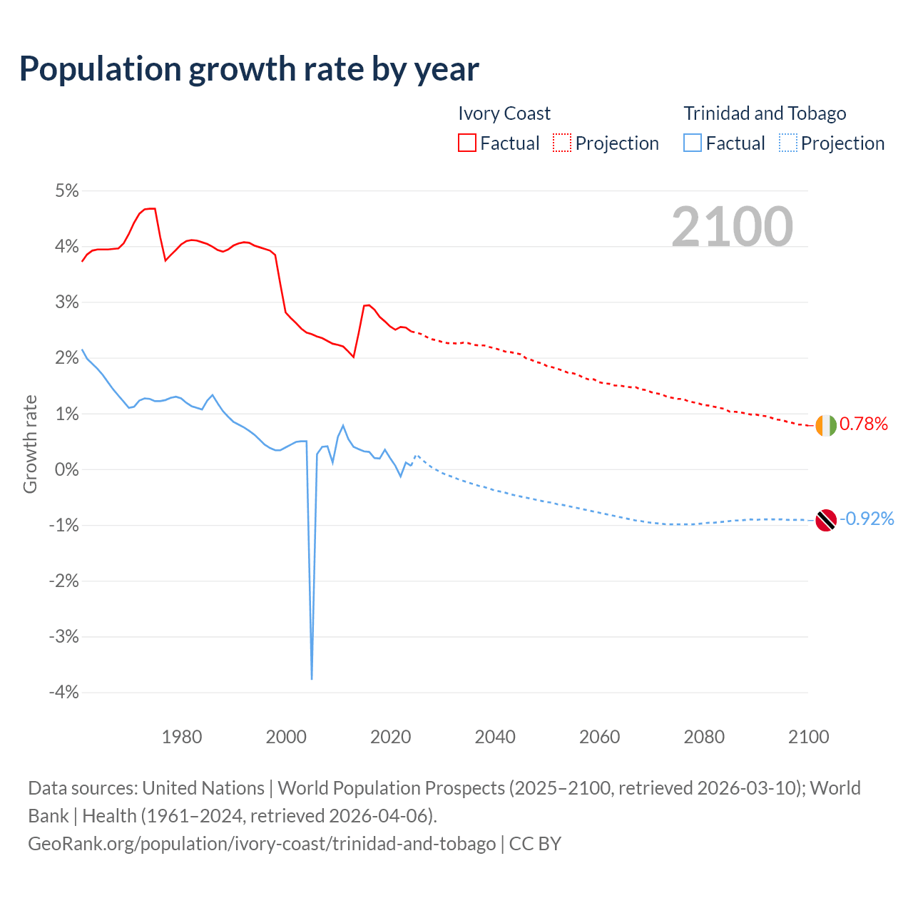 - For the last 10 years, Ivory Coast has had an average growth rate of +2.65% per year vs +0.19% in Trinidad and Tobago.