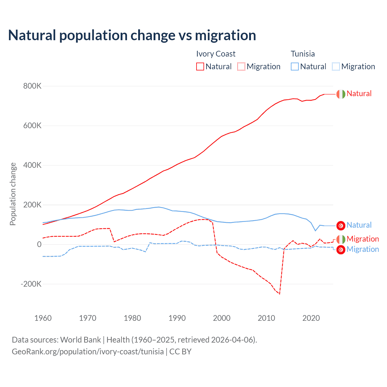 Over the last 10 years, 99.7% of the population change in Ivory Coast is from natural causes (a gain of 7,348,944 people) and 0.33% is from migration (a gain of 24,432 people). In Tunisia 86.3% is from natural causes (a gain of 1,225,079 people) and 13.7% is from migration (a loss of 195,011 people).