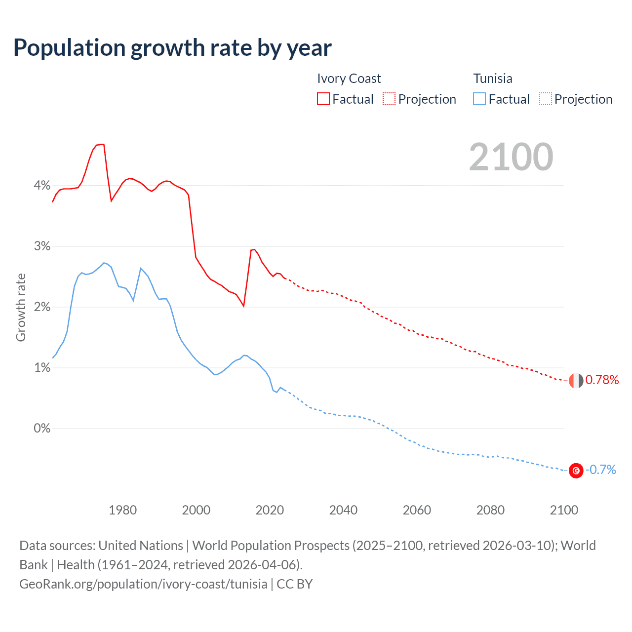 - For the last 10 years, Ivory Coast has had an average growth rate of +2.65% per year vs +0.89% in Tunisia.