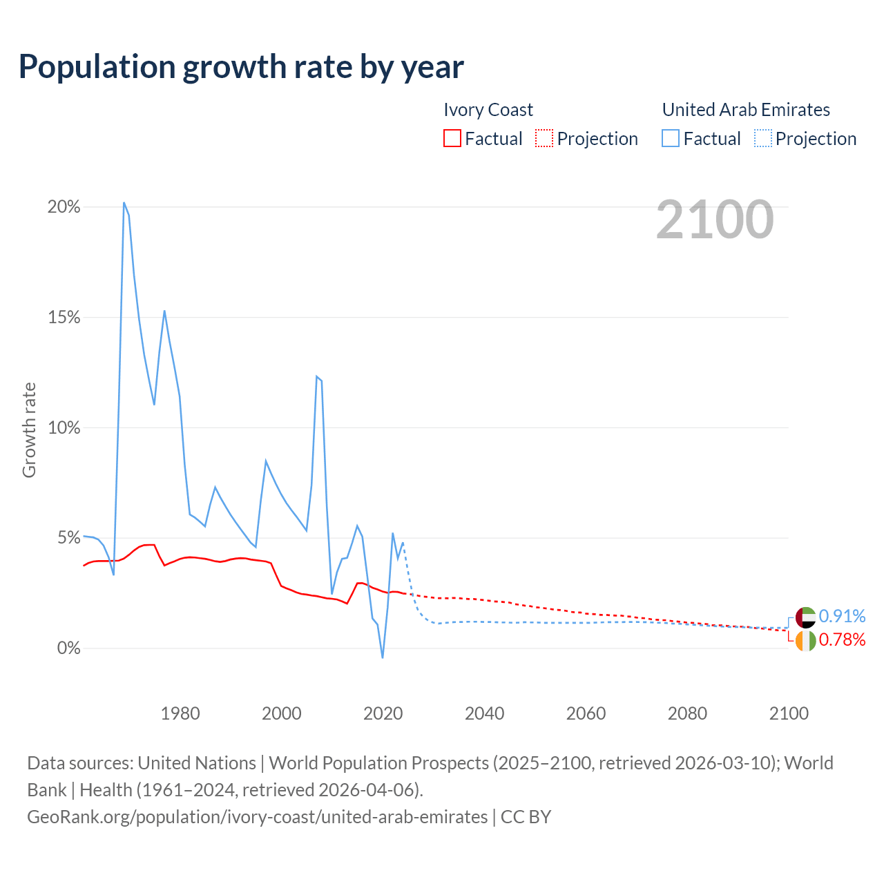 - For the last 10 years, Ivory Coast has had an average growth rate of +2.65% per year vs +3.31% in the United Arab Emirates.