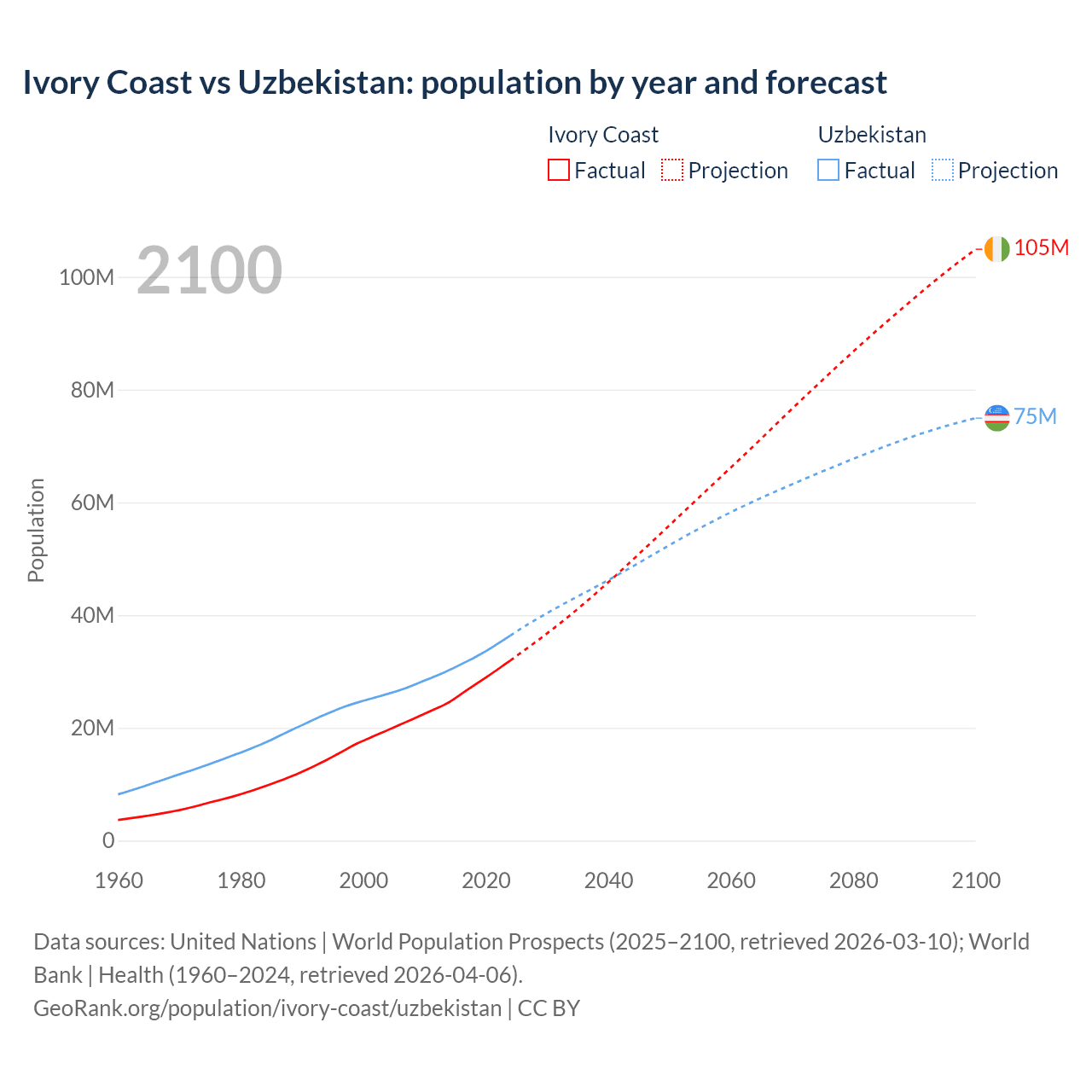 Ivory Coast vs Uzbekistan: population by year and forecast