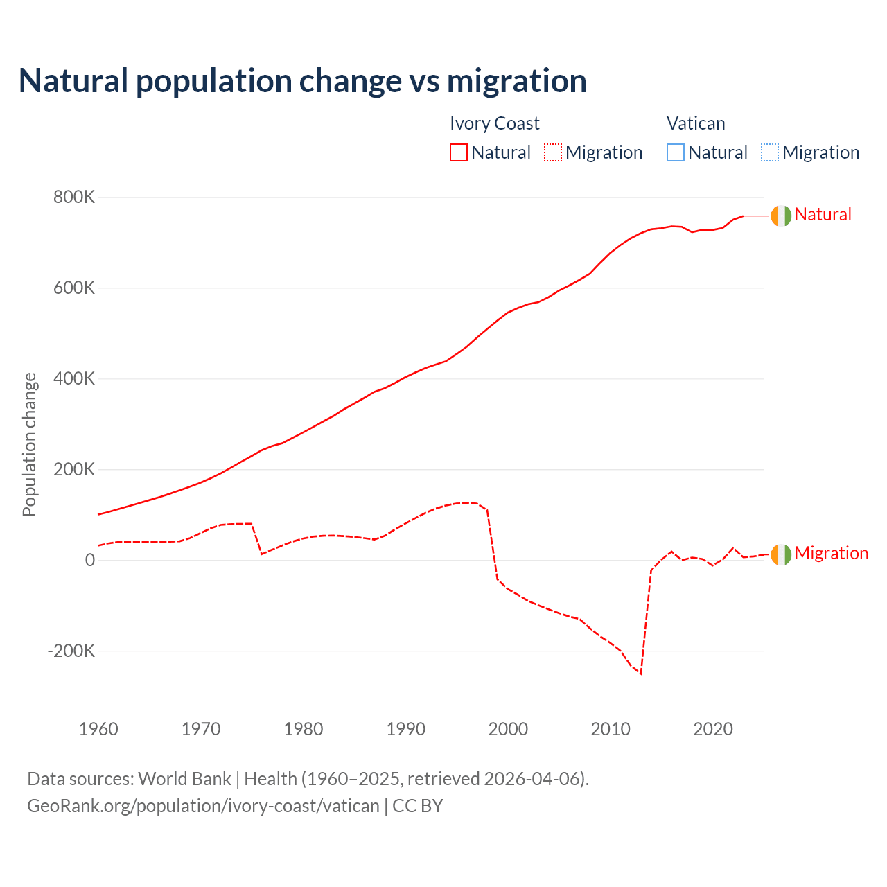 - For the last 10 years, Ivory Coast has had an average growth rate of +2.65% per year vs +1.9% in the Vatican.