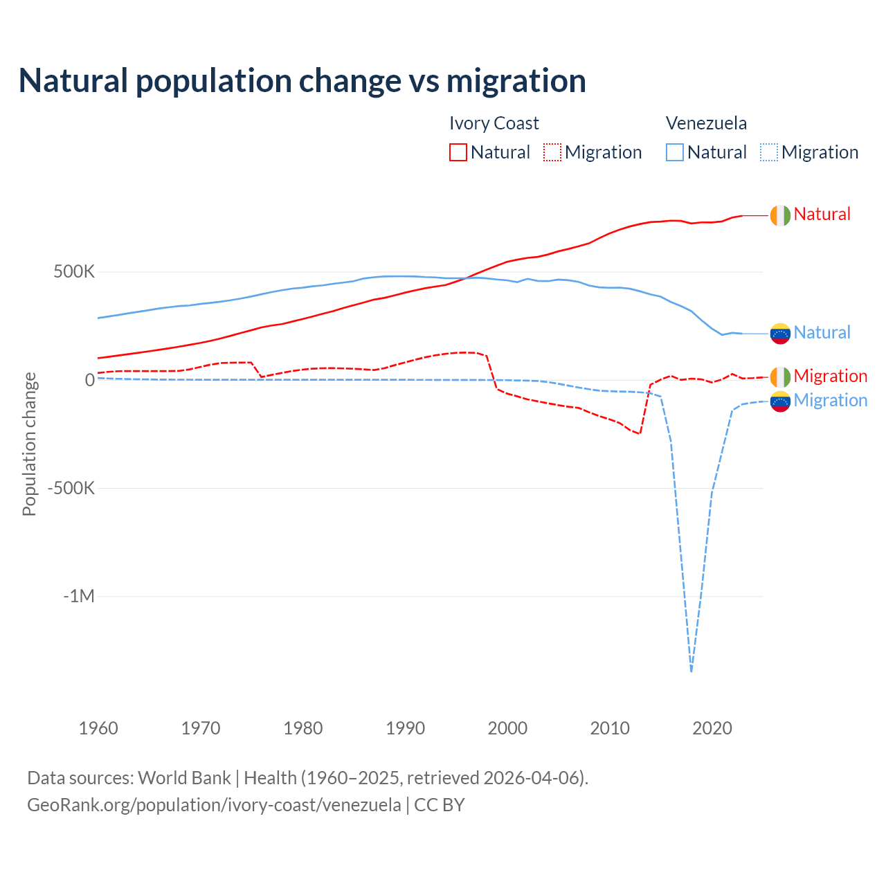 Over the last 10 years, 99.7% of the population change in Ivory Coast is from natural causes (a gain of 7,348,944 people) and 0.33% is from migration (a gain of 24,432 people). In Venezuela 38.6% is from natural causes (a gain of 2,946,257 people) and 61.4% is from migration (a loss of 4,683,227 people).