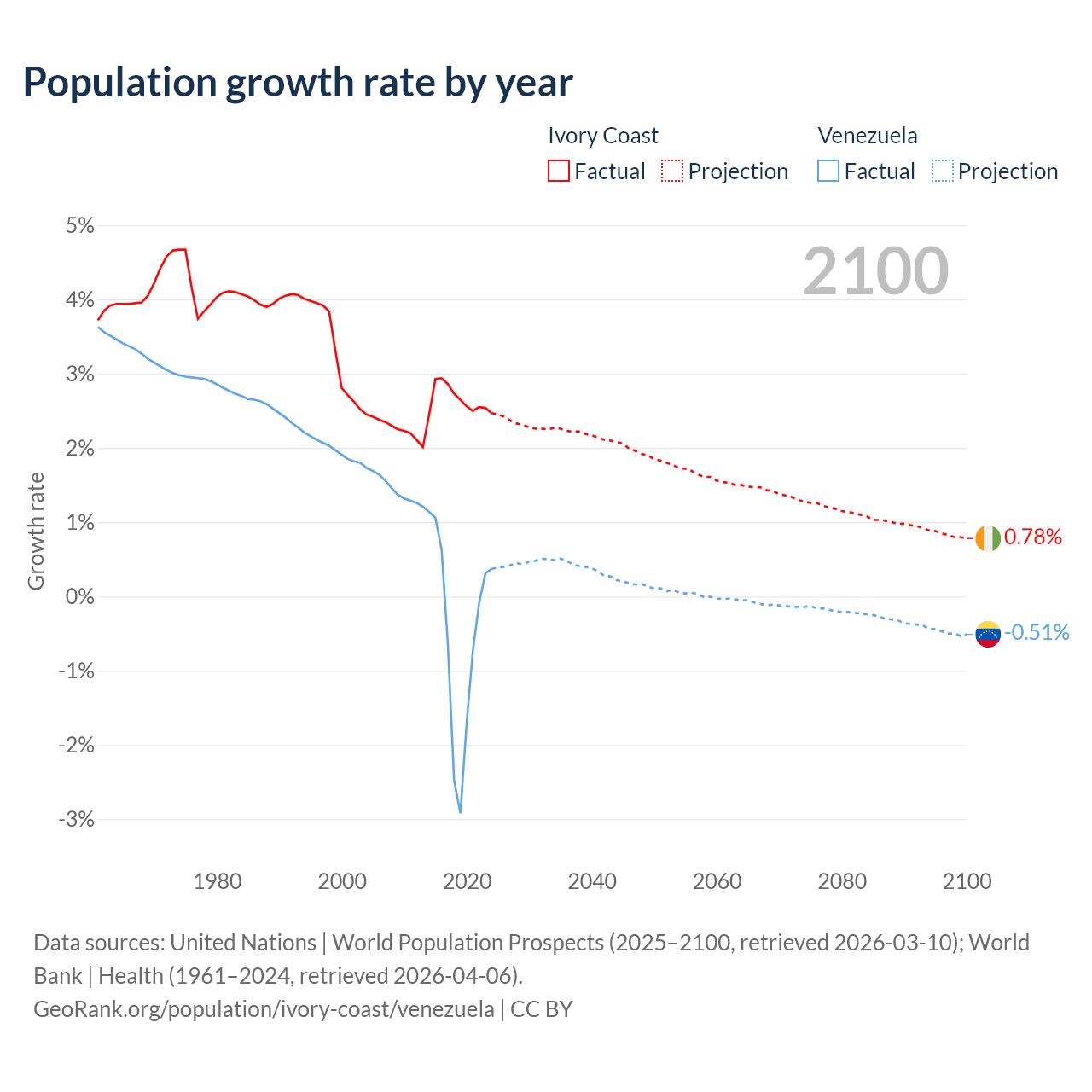 - For the last 10 years, Ivory Coast has had an average growth rate of +2.65% per year vs -0.46% in Venezuela.