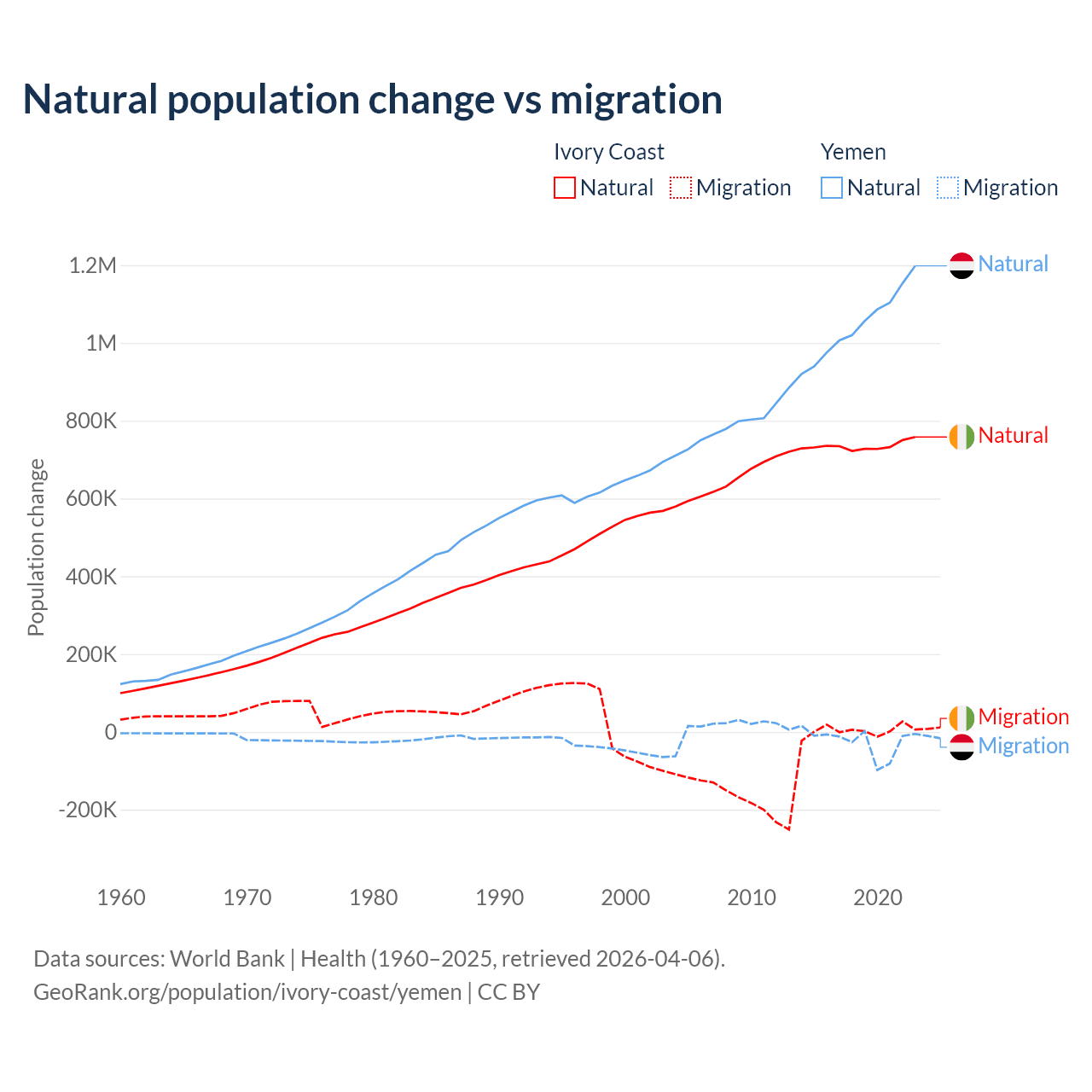 Over the last 10 years, 99.7% of the population change in Ivory Coast is from natural causes (a gain of 7,348,944 people) and 0.33% is from migration (a gain of 24,432 people). In Yemen 97.8% is from natural causes (a gain of 10,460,813 people) and 2.17% is from migration (a loss of 231,814 people).