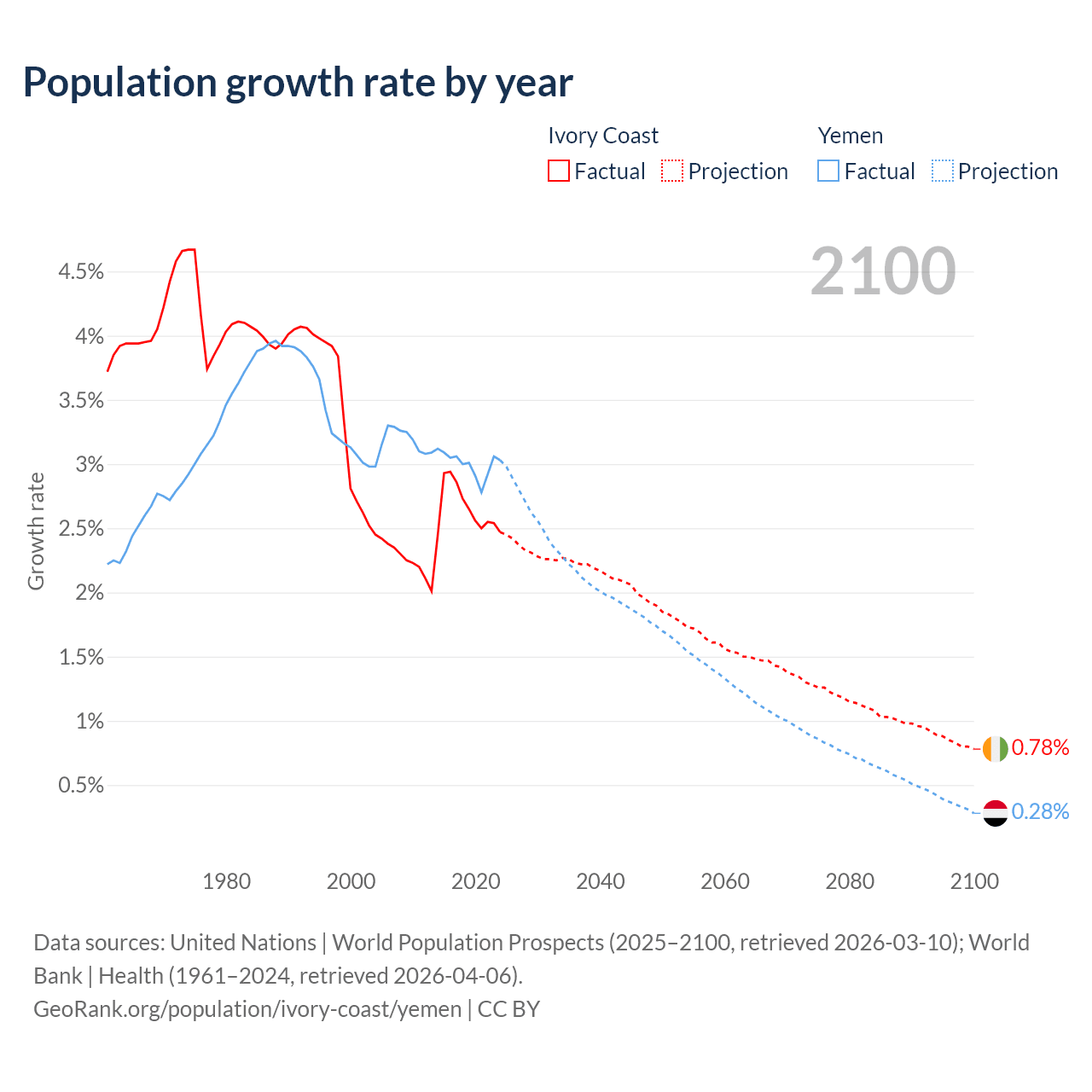 - For the last 10 years, Ivory Coast has had an average growth rate of +2.65% per year vs +3% in Yemen.