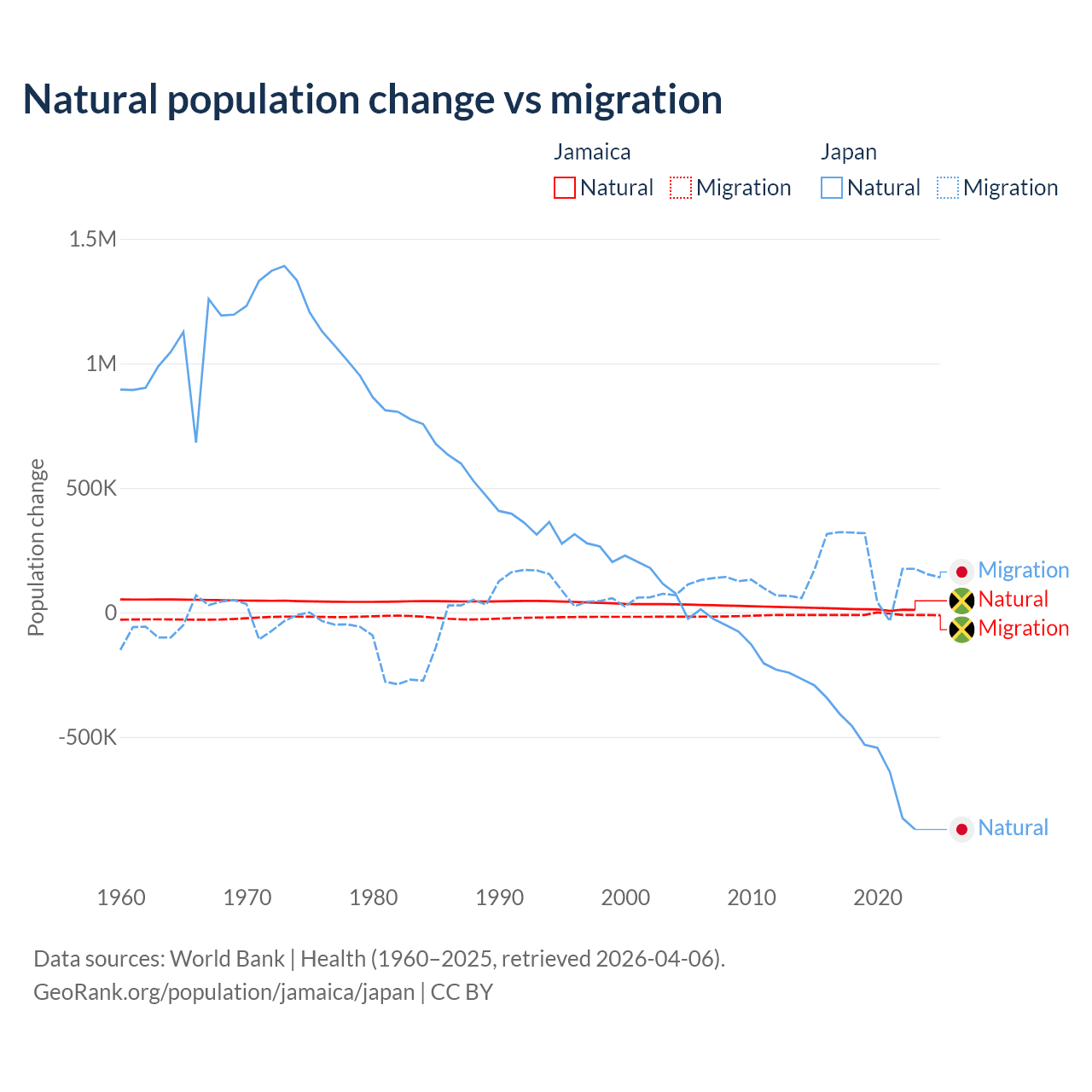 Over the last 10 years, 61.3% of the population change in Jamaica is from natural causes (a gain of 137,465 people) and 38.7% is from migration (a loss of 86,681 people). In Japan 73.6% is from natural causes (a loss of 5,178,838 people) and 26.4% is from migration (a gain of 1,860,103 people).