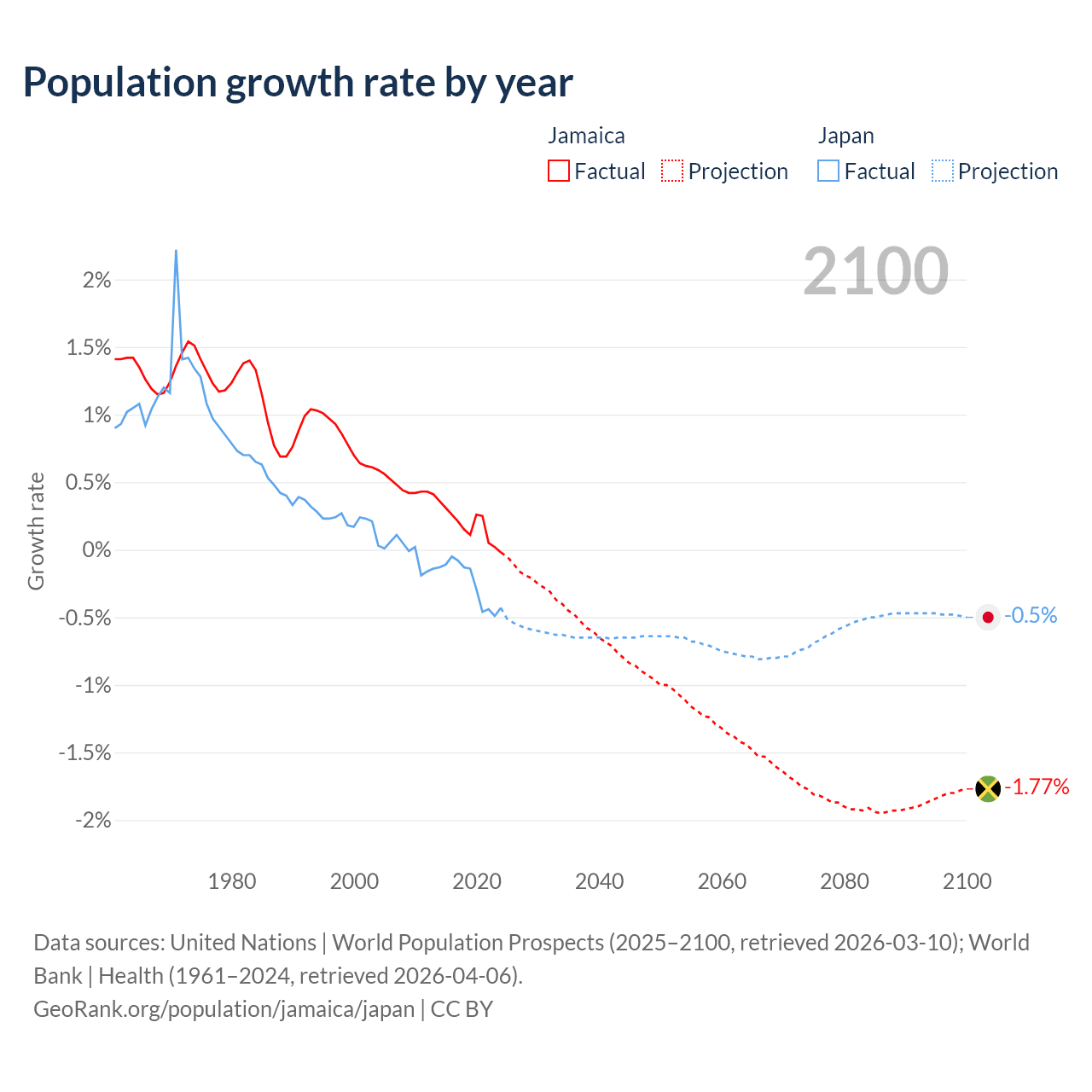 - For the last 10 years, Jamaica has had an average growth rate of +0.18% per year vs -0.25% in Japan.