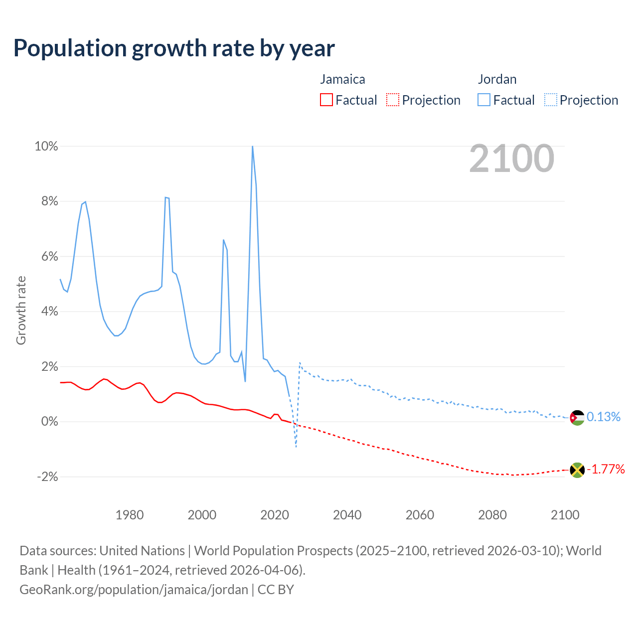 - For the last 10 years, Jamaica has had an average growth rate of +0.18% per year vs +3.45% in Jordan.