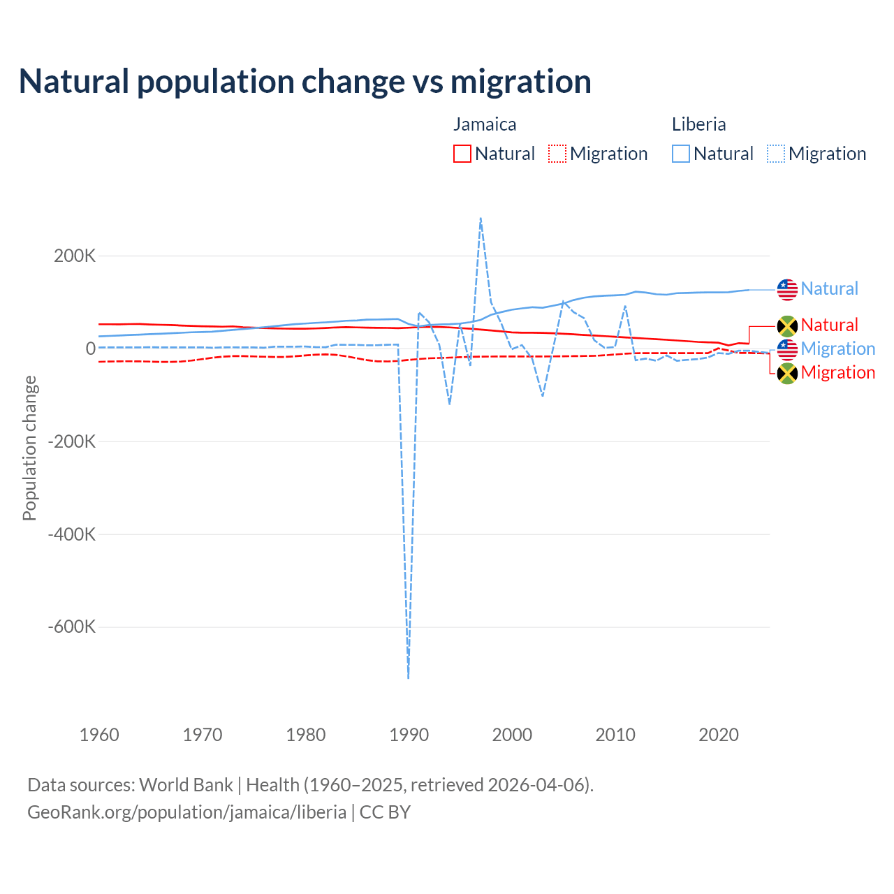 Over the last 10 years, 61.3% of the population change in Jamaica is from natural causes (a gain of 137,465 people) and 38.7% is from migration (a loss of 86,681 people). In Liberia 87.7% is from natural causes (a gain of 1,202,387 people) and 12.3% is from migration (a loss of 168,316 people).
