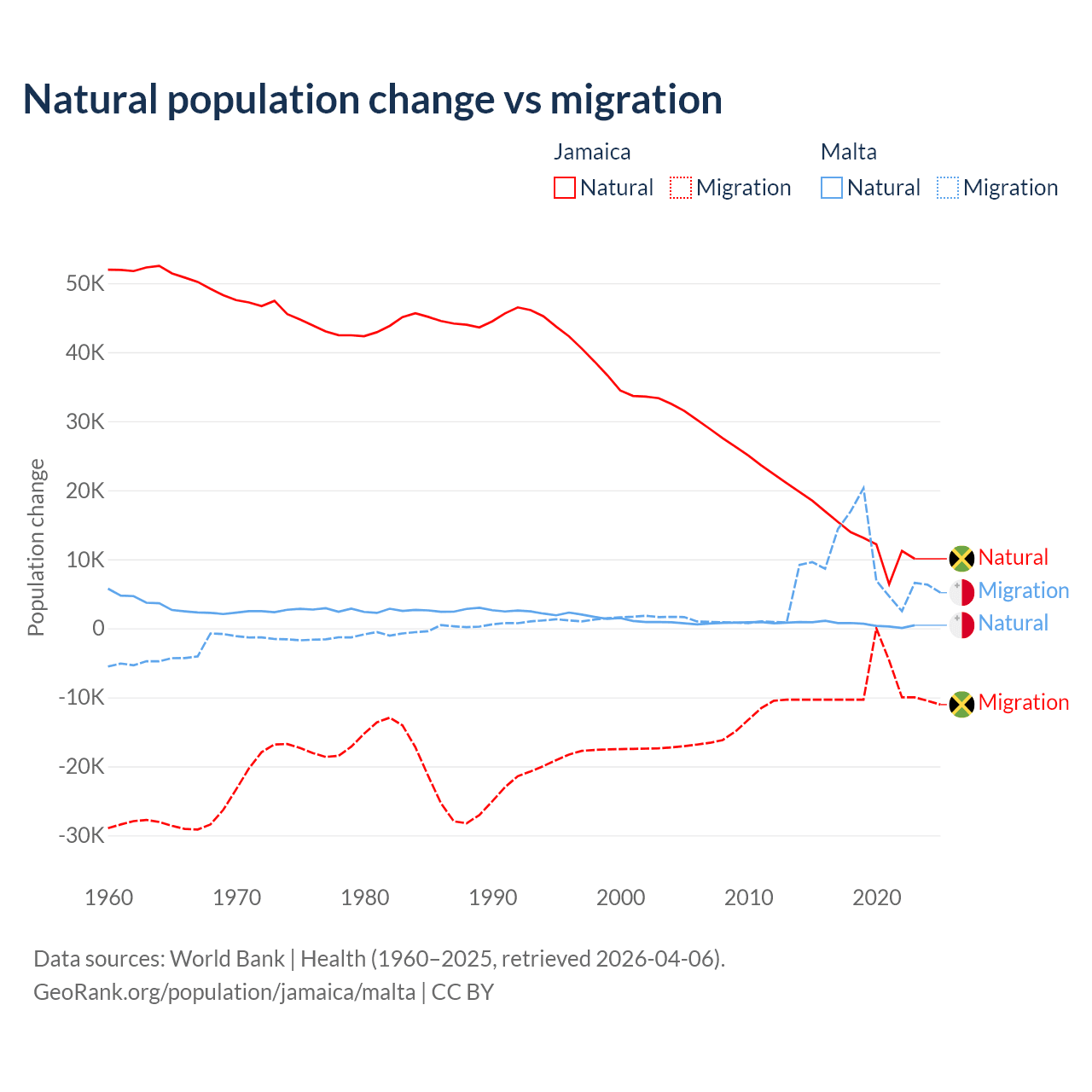 Over the last 10 years, 61.3% of the population change in Jamaica is from natural causes (a gain of 137,465 people) and 38.7% is from migration (a loss of 86,681 people). In Malta 5.84% is from natural causes (a gain of 6,181 people) and 94.2% is from migration (a gain of 99,652 people).