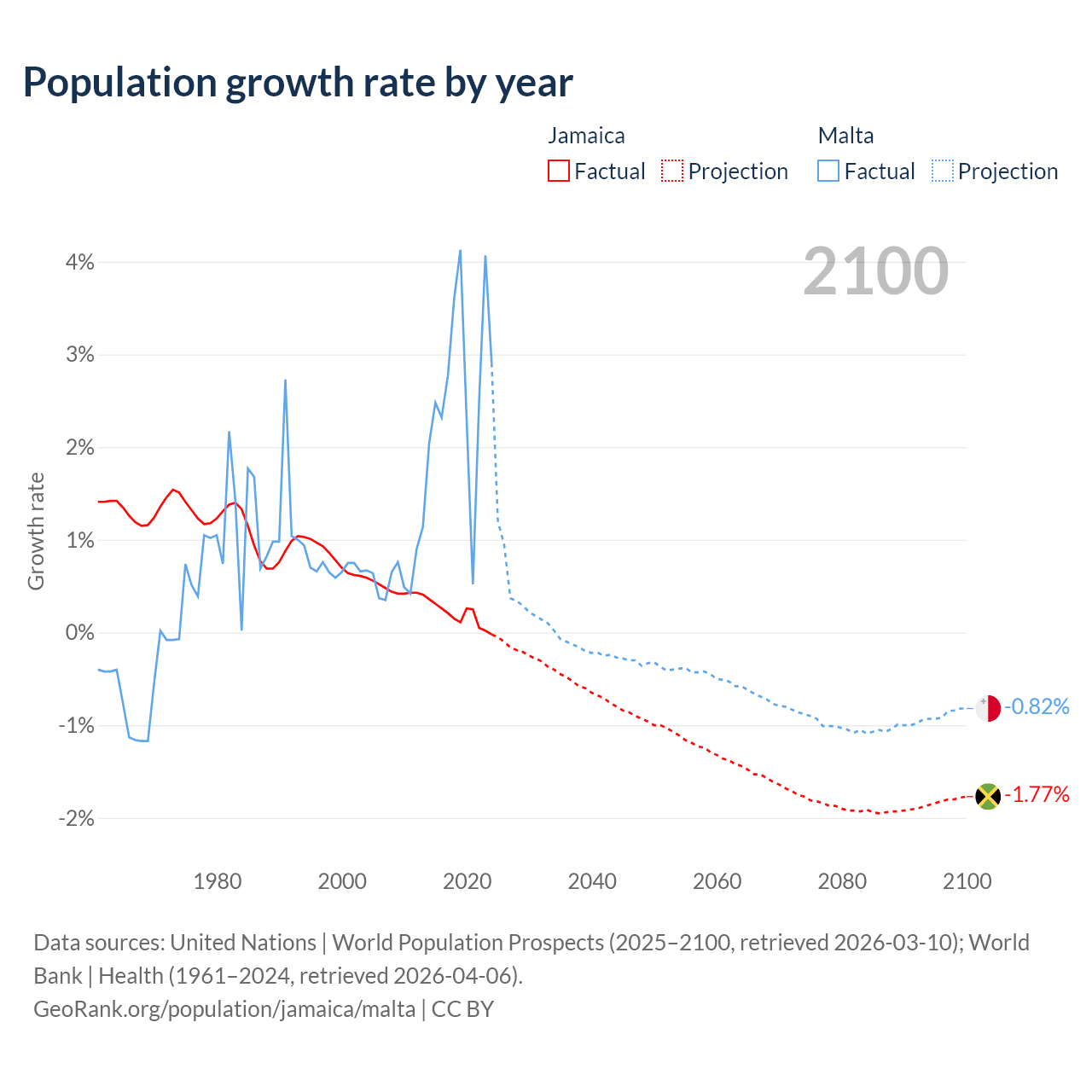 - For the last 10 years, Jamaica has had an average growth rate of +0.18% per year vs +2.69% in Malta.