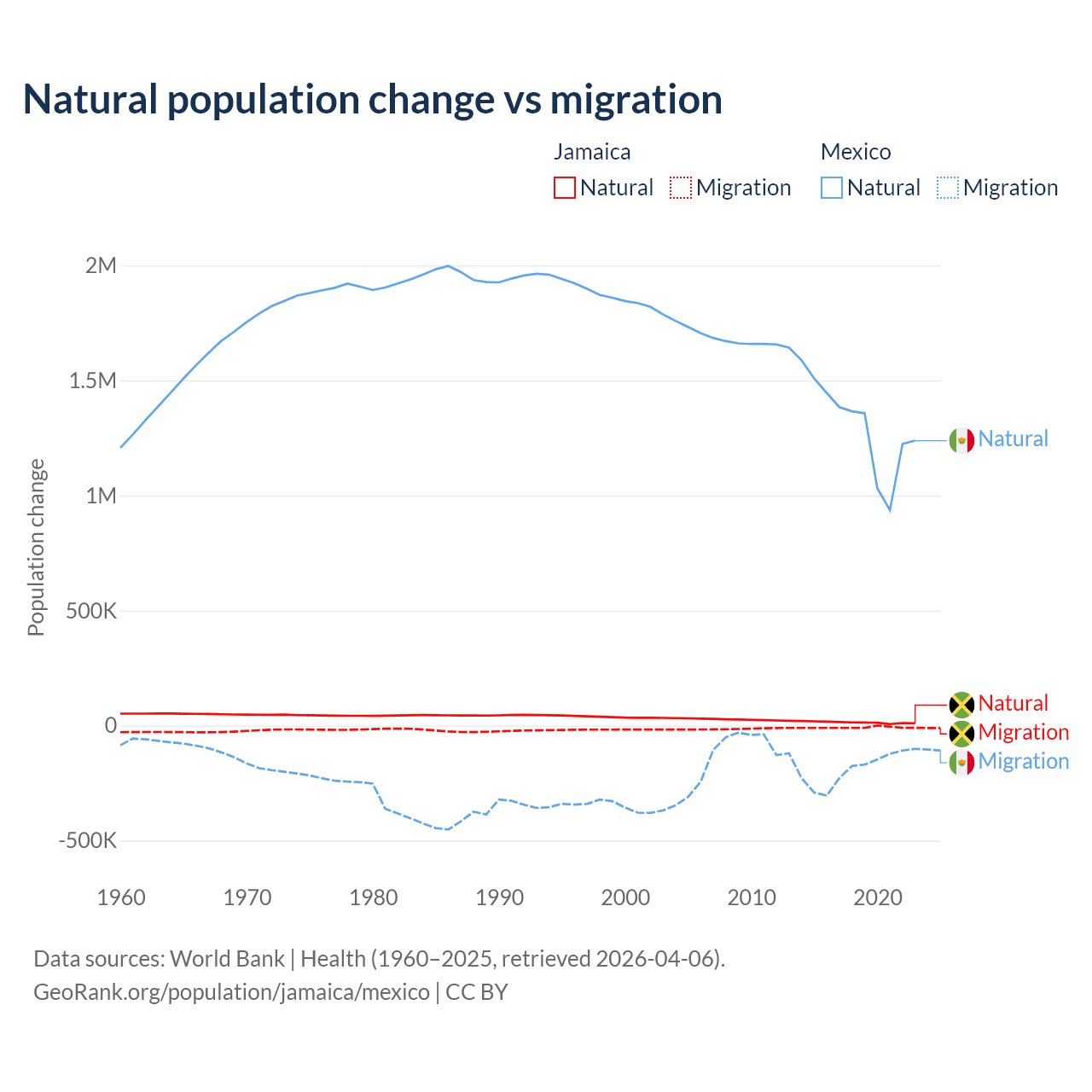 Over the last 10 years, 61.3% of the population change in Jamaica is from natural causes (a gain of 137,465 people) and 38.7% is from migration (a loss of 86,681 people). In Mexico 87.5% is from natural causes (a gain of 13,080,136 people) and 12.5% is from migration (a loss of 1,876,544 people).