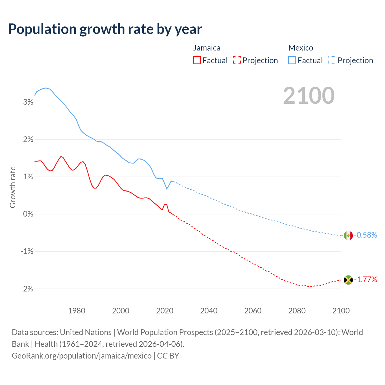 Data sources: World Bank | Health (1960–2024, retrieved 2026-04-06); United Nations | World Population Prospects (1960–2026, retrieved 2026-03-10); U.S. Census Bureau (1960–2025, retrieved 2026-02-08); Central Intelligence Agency (CIA) (2000–2019, retrieved 2026-02-20).