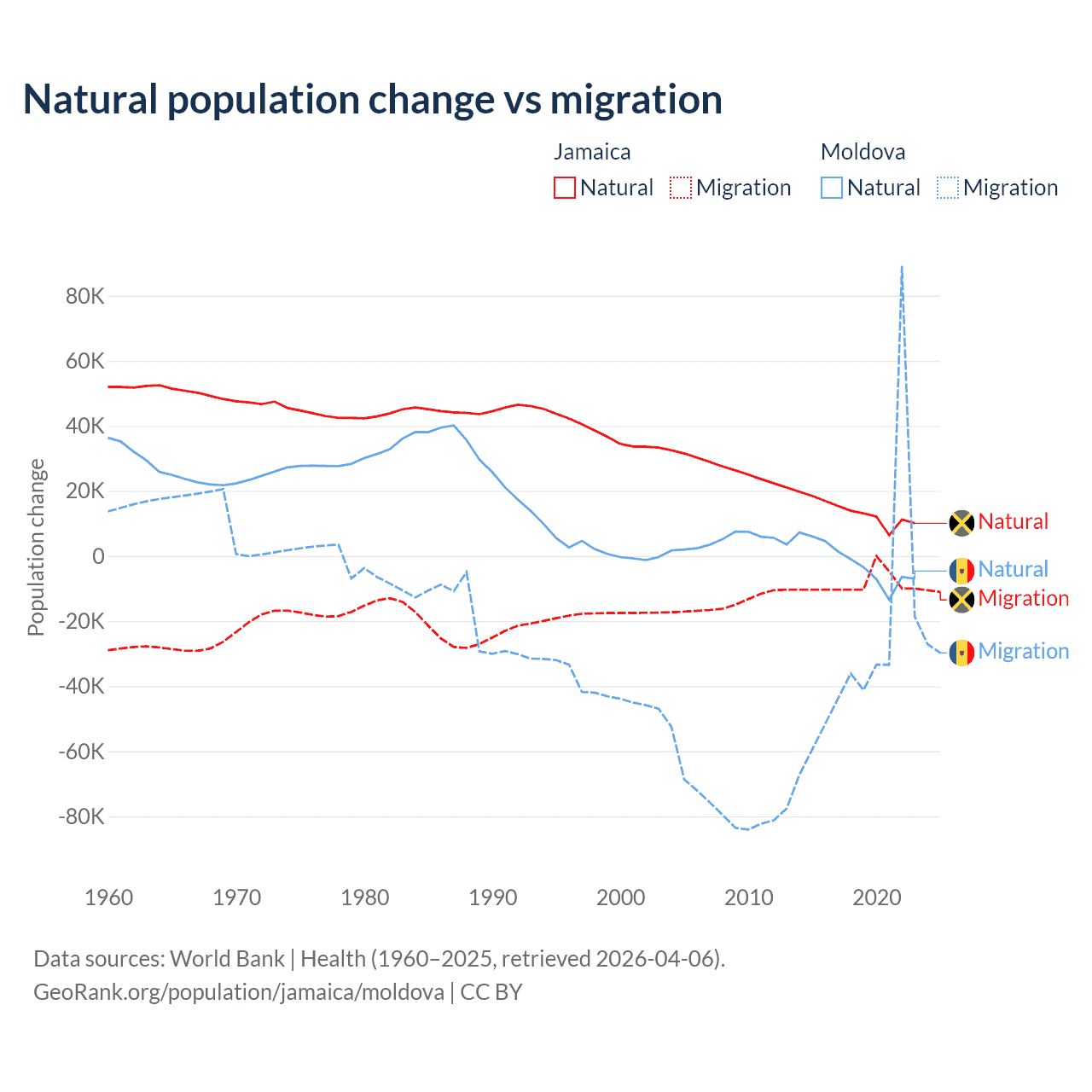 Over the last 10 years, 61.3% of the population change in Jamaica is from natural causes (a gain of 137,465 people) and 38.7% is from migration (a loss of 86,681 people). In Moldova 6.04% is from natural causes (a loss of 19,001 people) and 94% is from migration (a loss of 295,631 people).