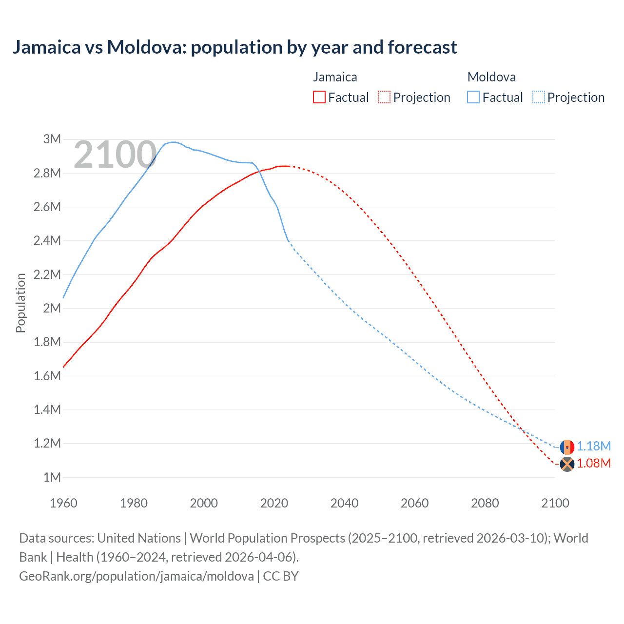 Jamaica vs Moldova: population by year and forecast