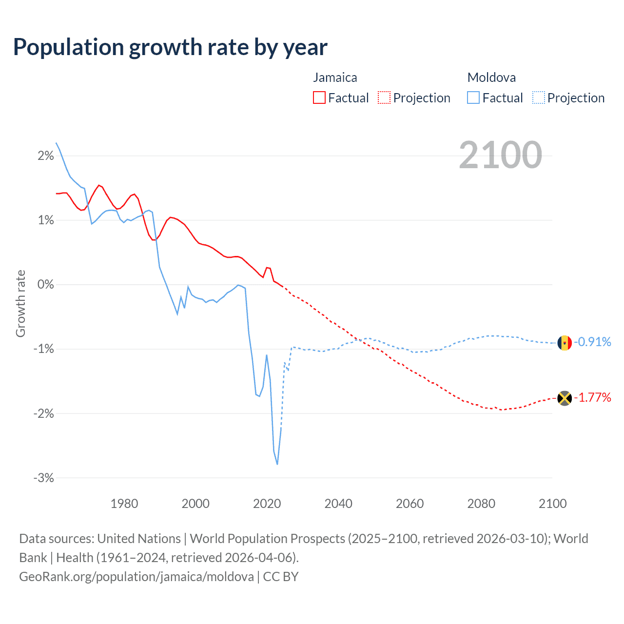 - For the last 10 years, Jamaica has had an average growth rate of +0.18% per year vs -1.57% in Moldova.