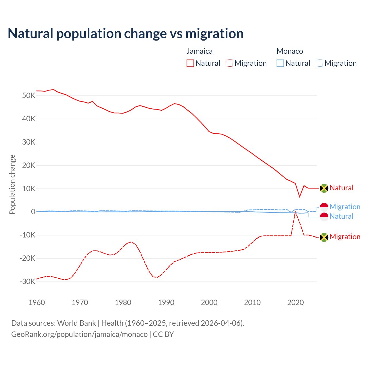 Over the last 10 years, 61.3% of the population change in Jamaica is from natural causes (a gain of 137,465 people) and 38.7% is from migration (a loss of 86,681 people). In Monaco 37.3% is from natural causes (a loss of 4,357 people) and 62.7% is from migration (a gain of 7,333 people).