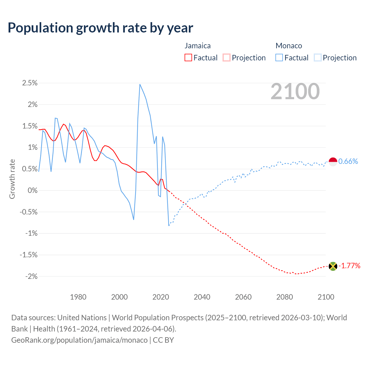- For the last 10 years, Jamaica has had an average growth rate of +0.18% per year vs +0.79% in Monaco.