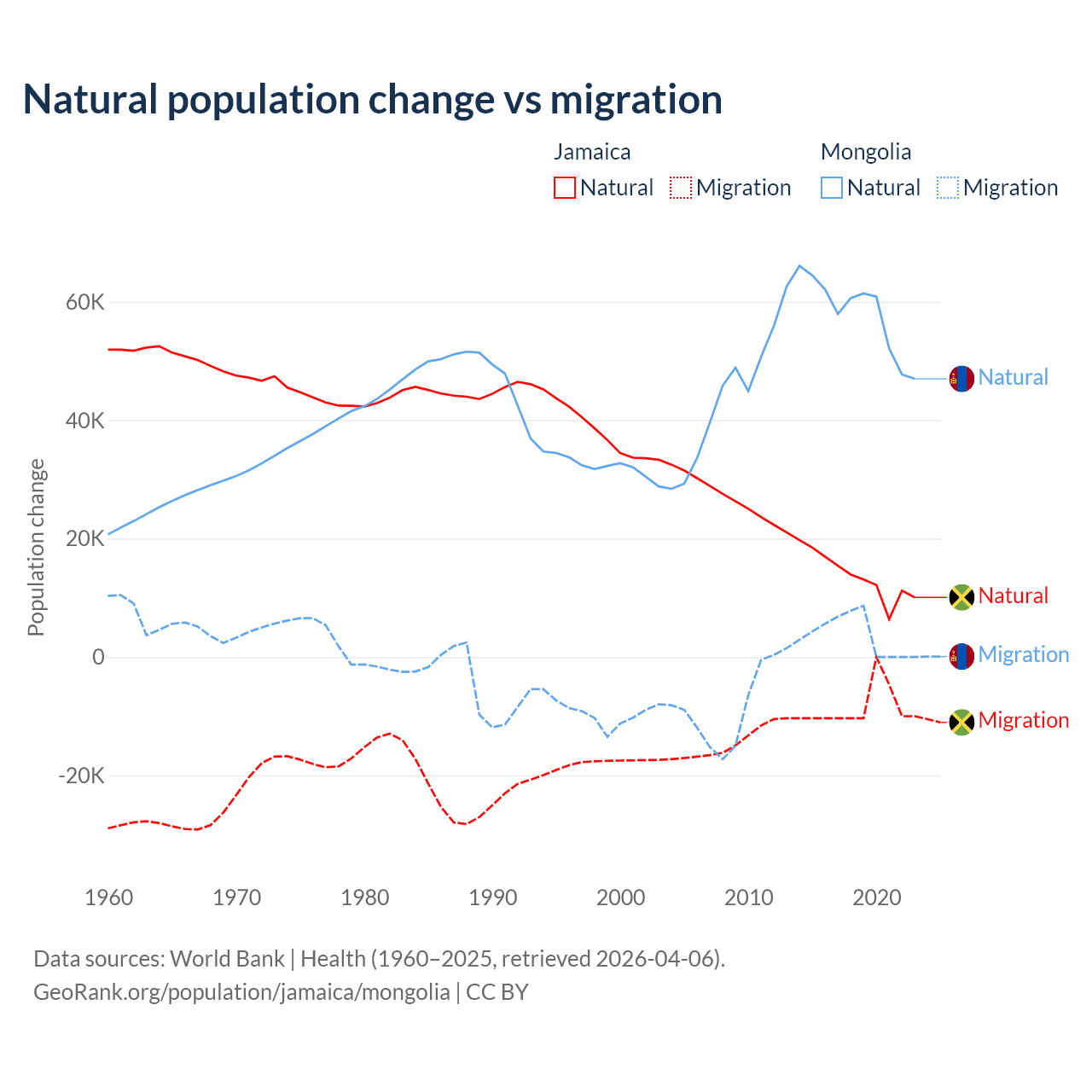 Over the last 10 years, 61.3% of the population change in Jamaica is from natural causes (a gain of 137,465 people) and 38.7% is from migration (a loss of 86,681 people). In Mongolia 94.1% is from natural causes (a gain of 580,367 people) and 5.87% is from migration (a gain of 36,163 people).