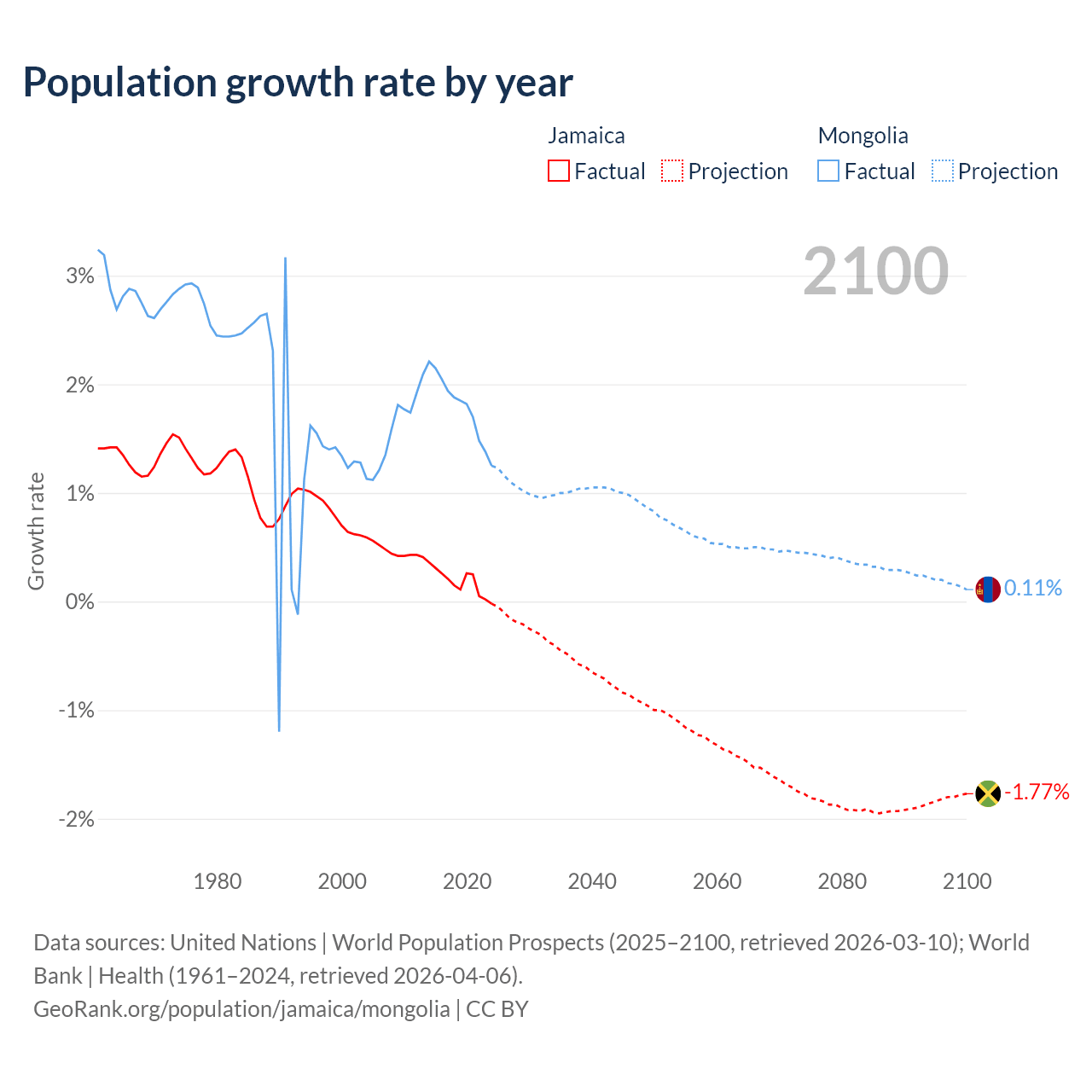 - For the last 10 years, Jamaica has had an average growth rate of +0.18% per year vs +1.79% in Mongolia.