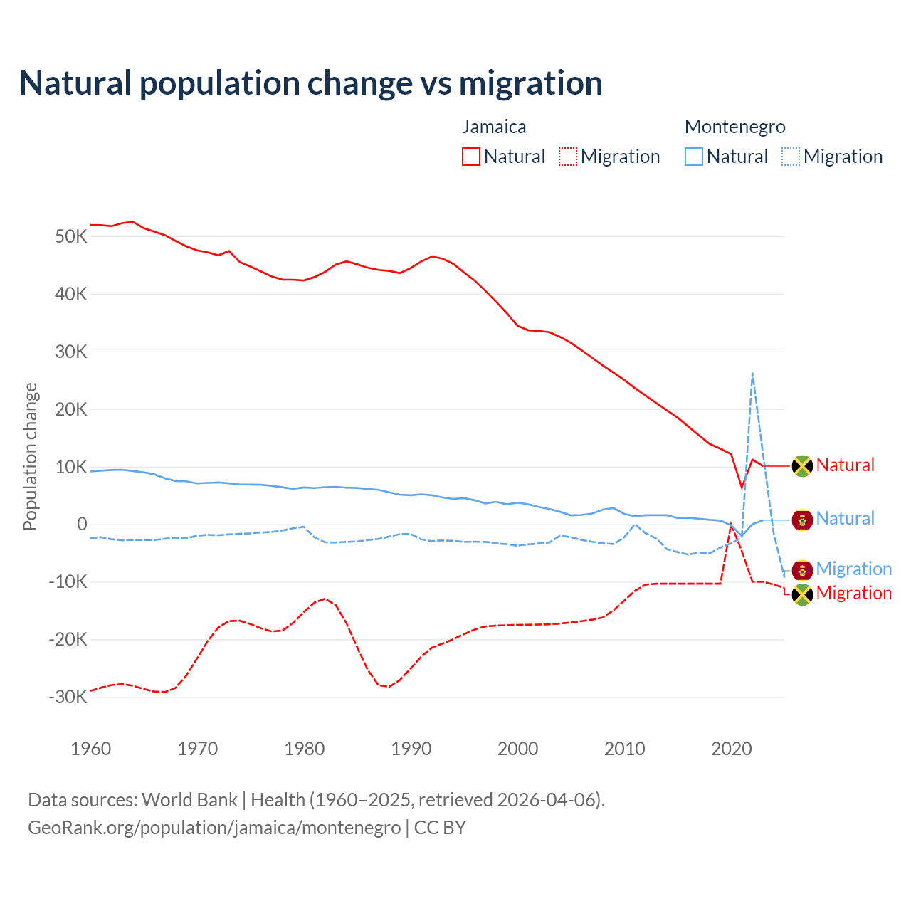 Over the last 10 years, 61.3% of the population change in Jamaica is from natural causes (a gain of 137,465 people) and 38.7% is from migration (a loss of 86,681 people). In Montenegro 52.4% is from natural causes (a gain of 4,501 people) and 47.6% is from migration (a gain of 4,095 people).