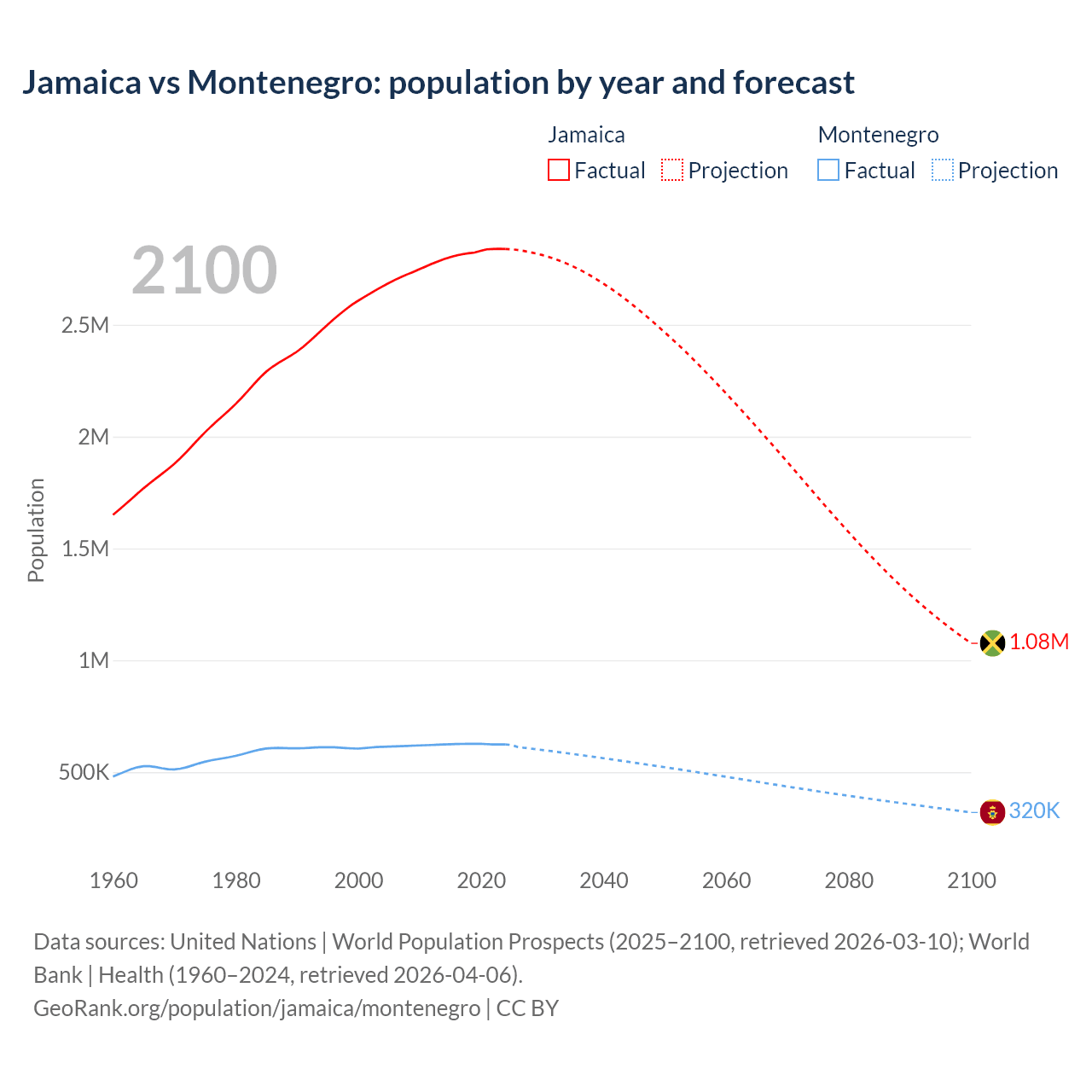 Jamaica vs Montenegro: population by year and forecast