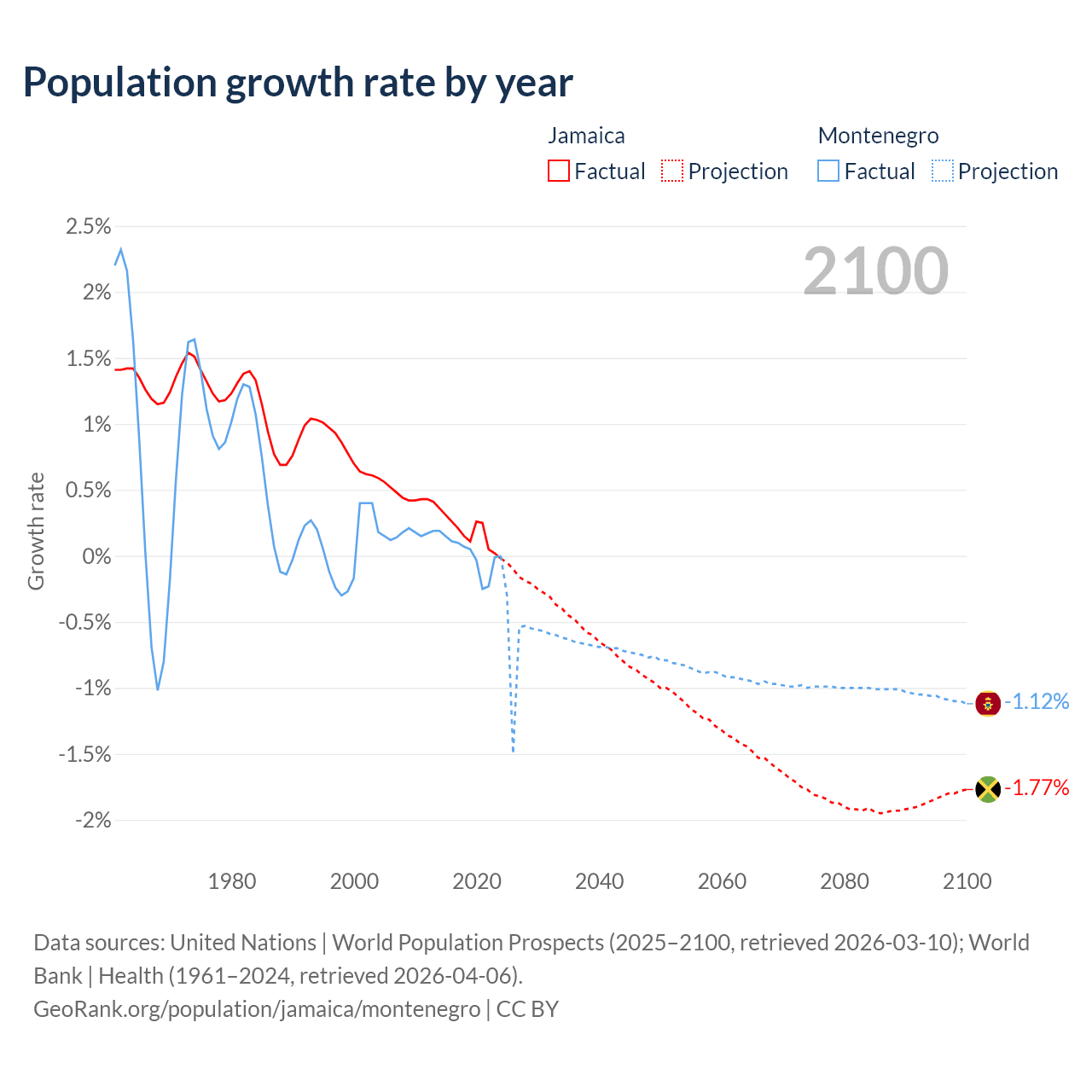 - For the last 10 years, Jamaica has had an average growth rate of +0.18% per year vs +0.01% in Montenegro.