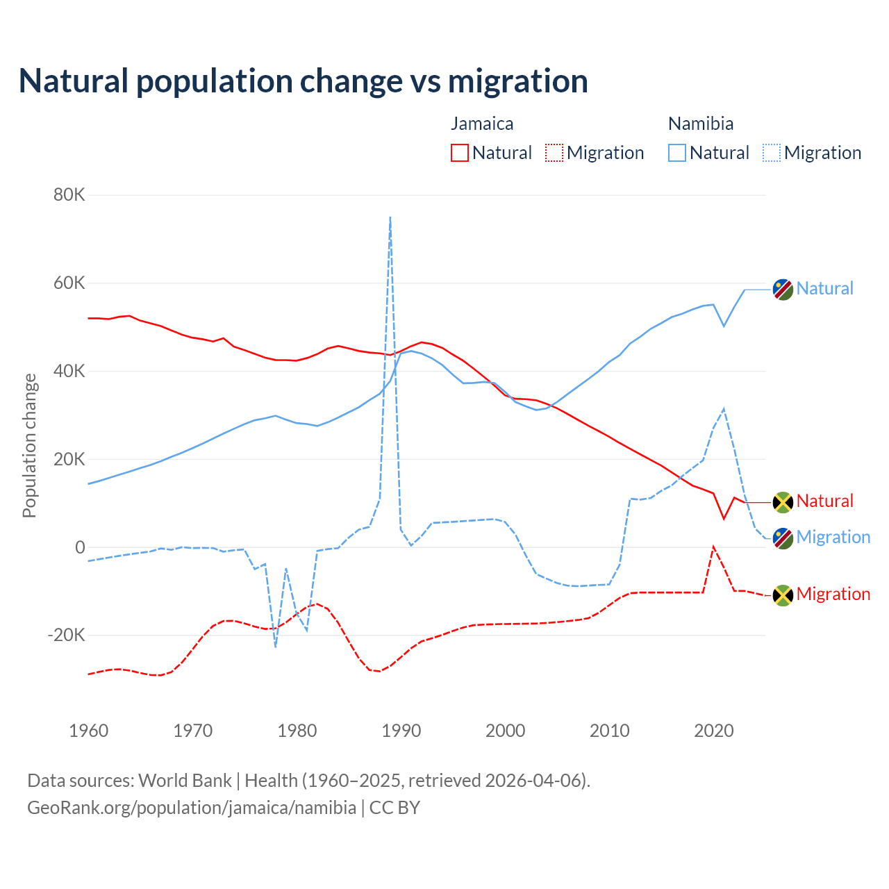 Over the last 10 years, 61.3% of the population change in Jamaica is from natural causes (a gain of 137,465 people) and 38.7% is from migration (a loss of 86,681 people). In Namibia 74.3% is from natural causes (a gain of 532,532 people) and 25.7% is from migration (a gain of 183,837 people).