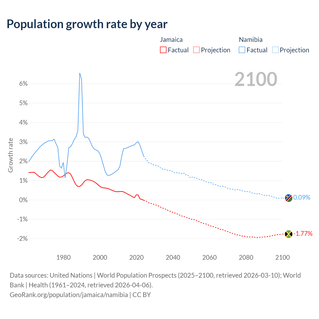 - For the last 10 years, Jamaica has had an average growth rate of +0.18% per year vs +2.73% in Namibia.