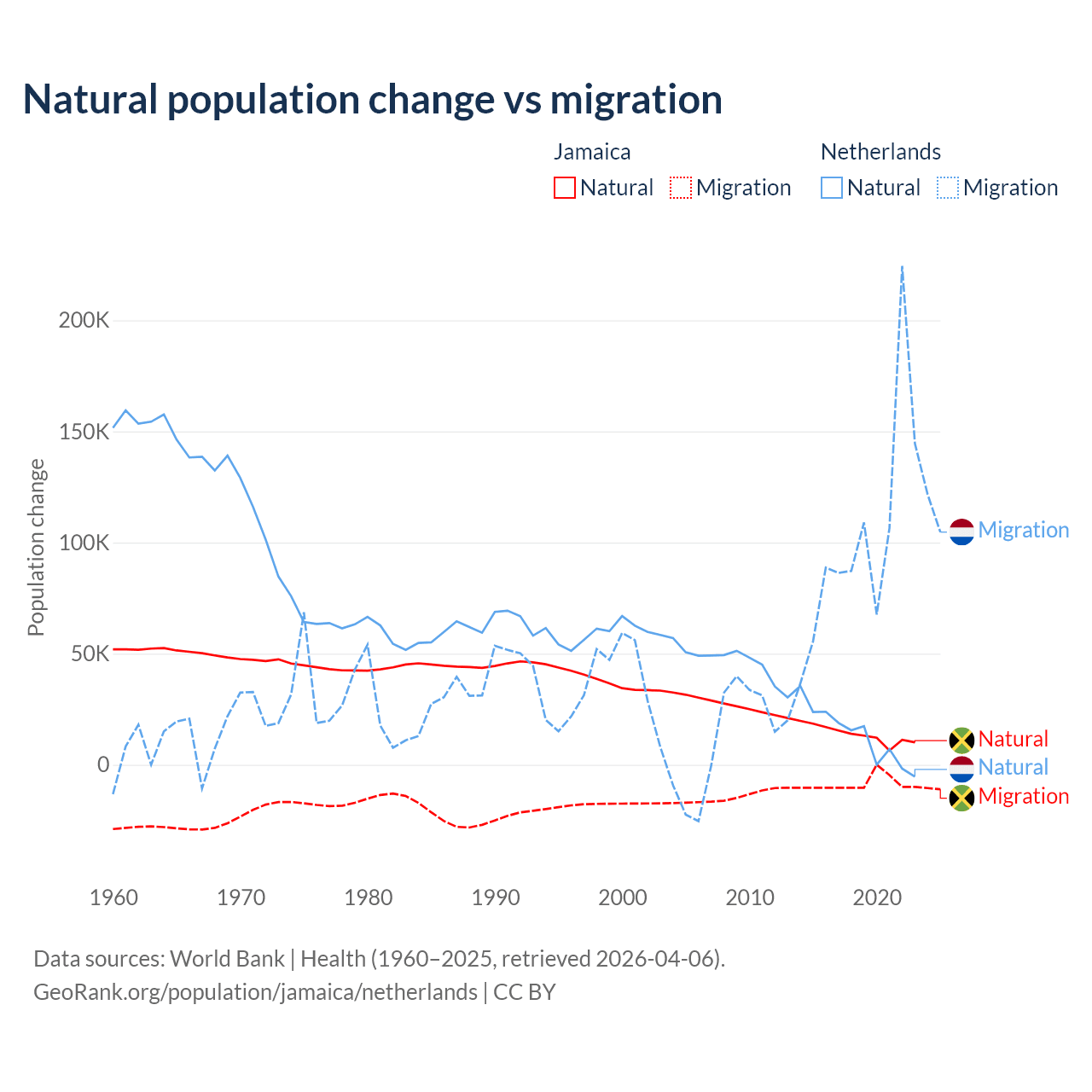 Over the last 10 years, 61.3% of the population change in Jamaica is from natural causes (a gain of 137,465 people) and 38.7% is from migration (a loss of 86,681 people). In the Netherlands 11.8% is from natural causes (a gain of 134,554 people) and 88.2% is from migration (a gain of 1,006,495 people).