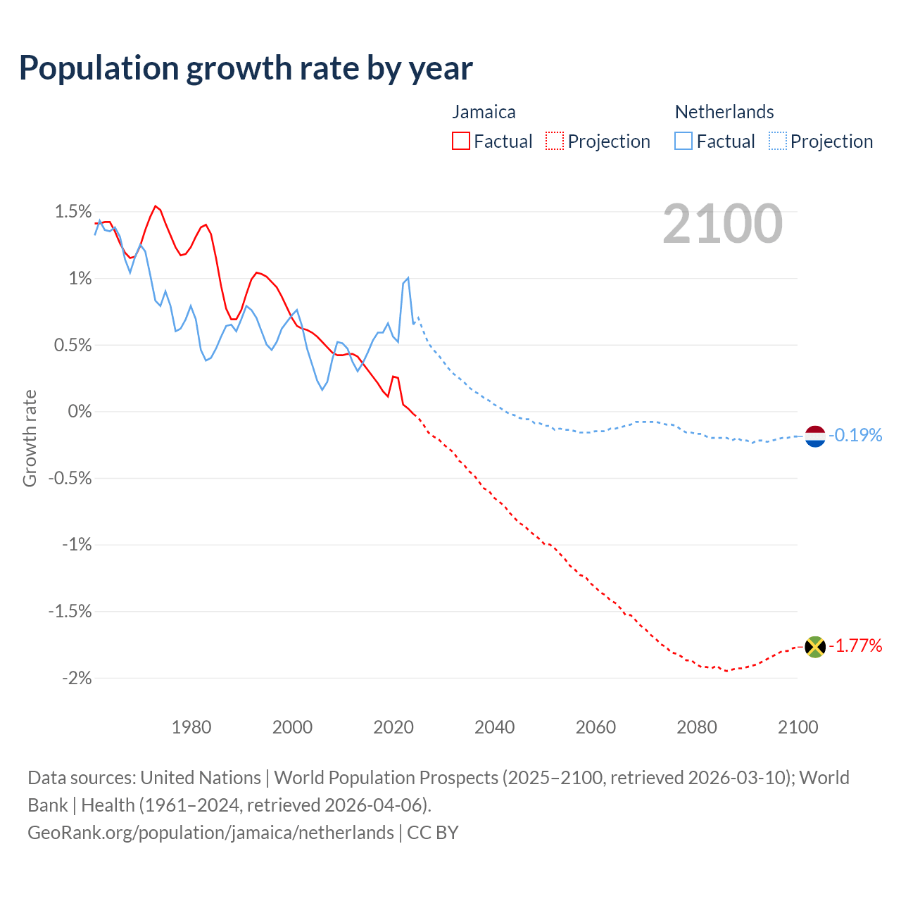 - For the last 10 years, Jamaica has had an average growth rate of +0.18% per year vs +0.62% in the Netherlands.