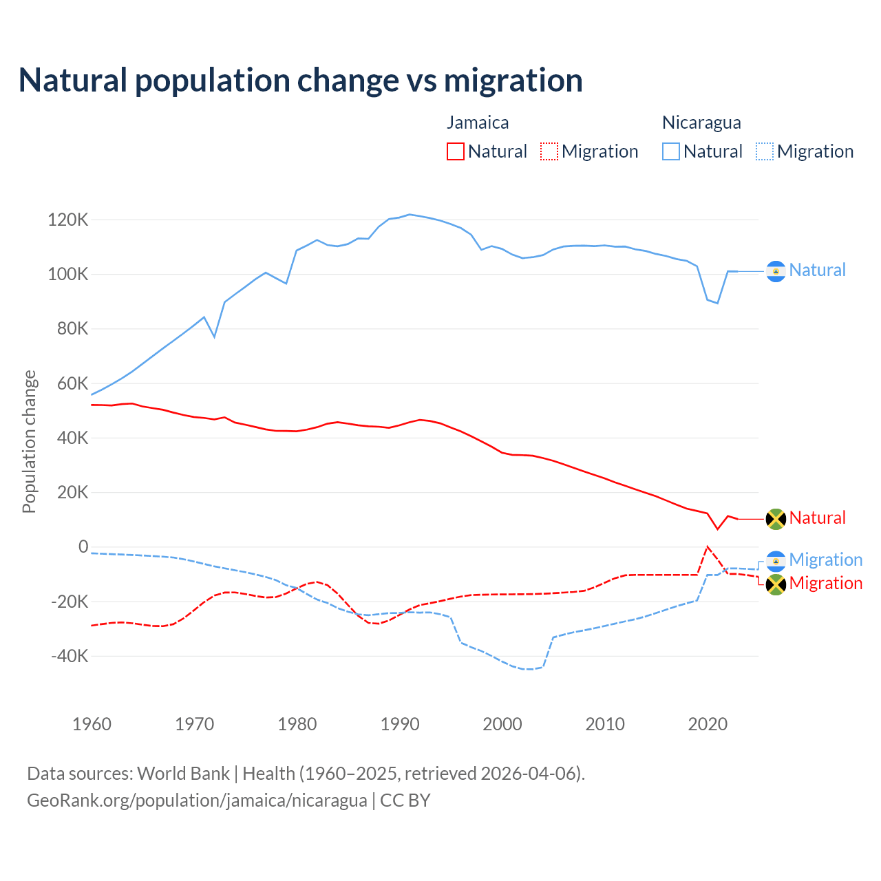 Over the last 10 years, 61.3% of the population change in Jamaica is from natural causes (a gain of 137,465 people) and 38.7% is from migration (a loss of 86,681 people). In Nicaragua 85.5% is from natural causes (a gain of 1,017,084 people) and 14.5% is from migration (a loss of 172,078 people).