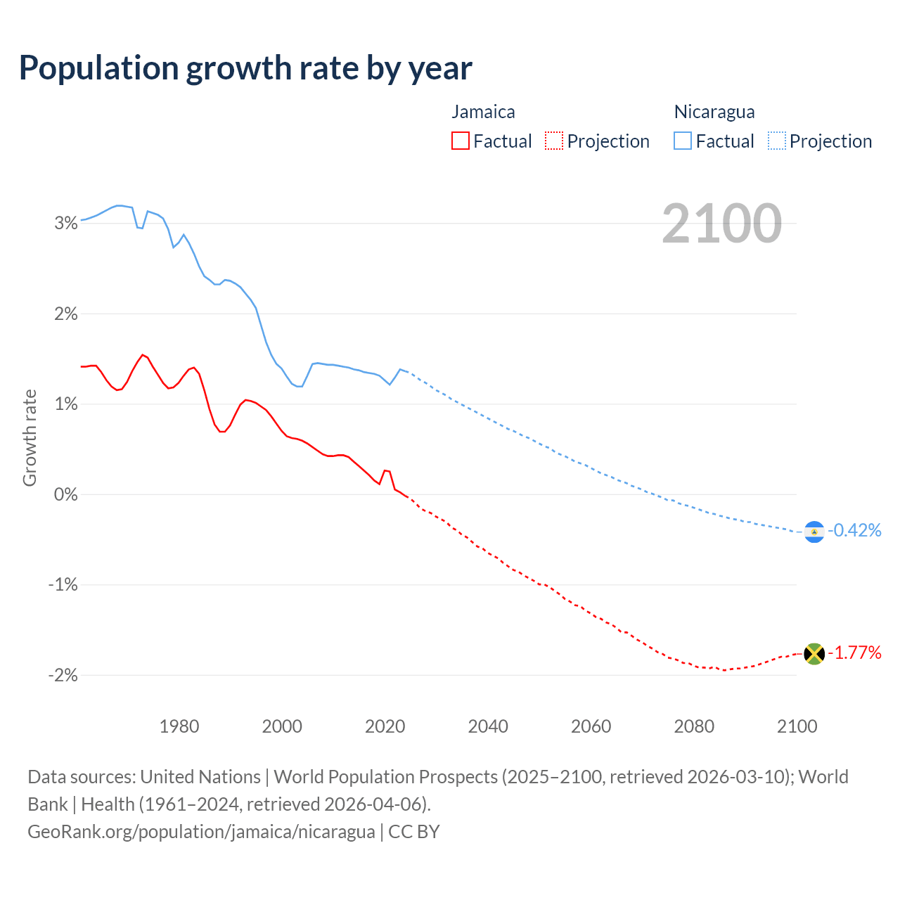 - For the last 10 years, Jamaica has had an average growth rate of +0.18% per year vs +1.33% in Nicaragua.