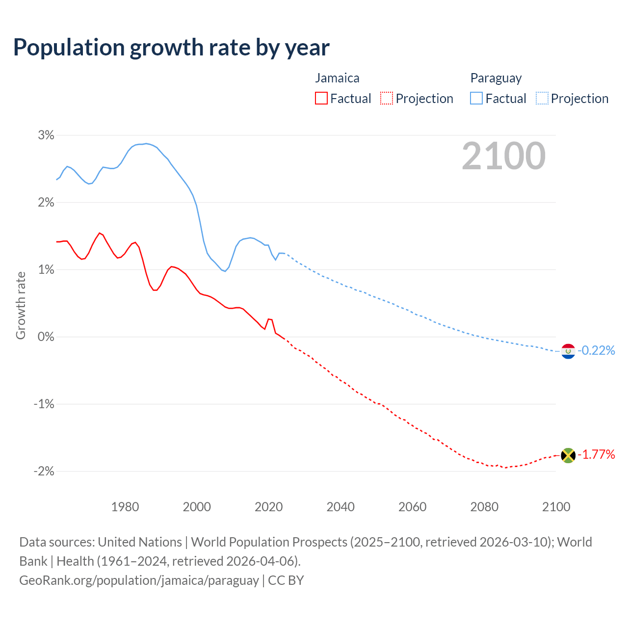 - For the last 10 years, Jamaica has had an average growth rate of +0.18% per year vs +1.34% in Paraguay.