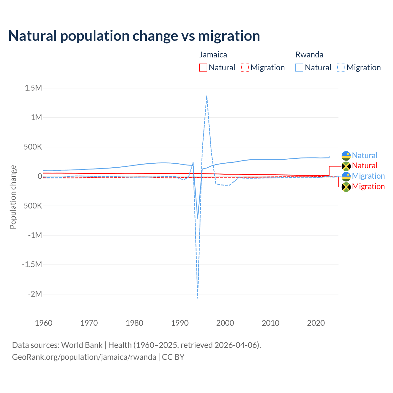 Over the last 10 years, 61.3% of the population change in Jamaica is from natural causes (a gain of 137,465 people) and 38.7% is from migration (a loss of 86,681 people). In Rwanda 93.8% is from natural causes (a gain of 3,081,296 people) and 6.18% is from migration (a loss of 203,035 people).