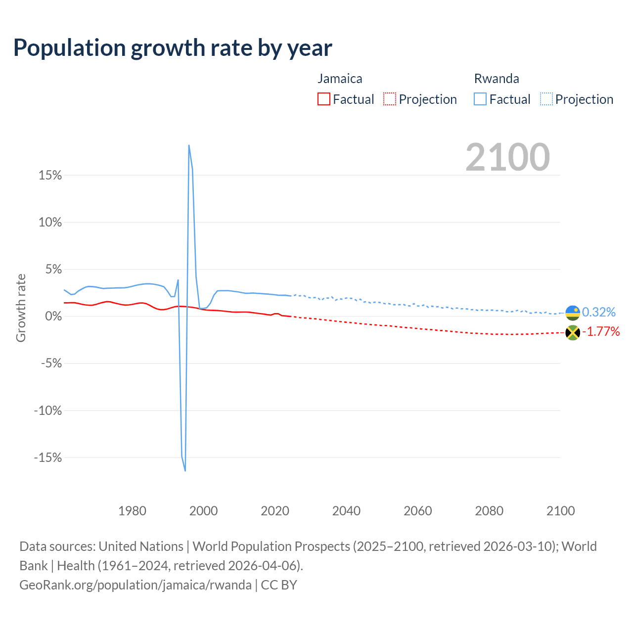 - For the last 10 years, Jamaica has had an average growth rate of +0.18% per year vs +2.31% in Rwanda.