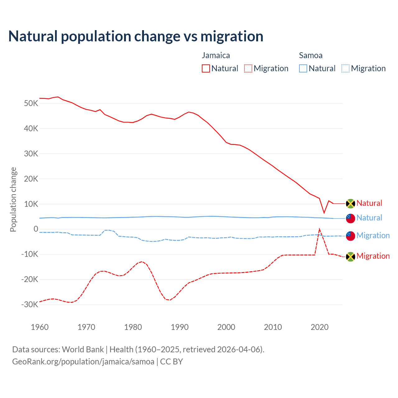 Over the last 10 years, 61.3% of the population change in Jamaica is from natural causes (a gain of 137,465 people) and 38.7% is from migration (a loss of 86,681 people). In Samoa 62.5% is from natural causes (a gain of 45,436 people) and 37.5% is from migration (a loss of 27,246 people).