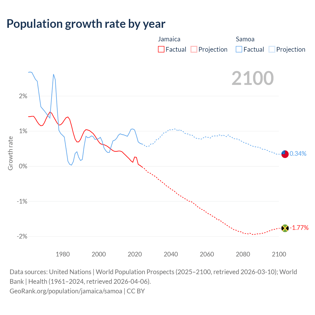 - For the last 10 years, Jamaica has had an average growth rate of +0.18% per year vs +0.87% in Samoa.