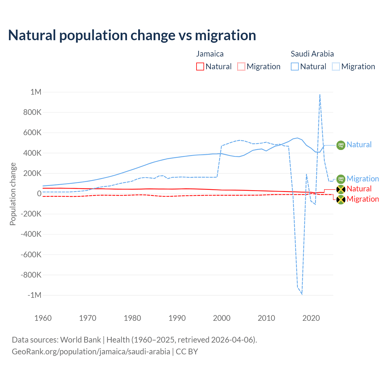 Over the last 10 years, 61.3% of the population change in Jamaica is from natural causes (a gain of 137,465 people) and 38.7% is from migration (a loss of 86,681 people). In Saudi Arabia 93.9% is from natural causes (a gain of 4,829,562 people) and 6.05% is from migration (a gain of 311,209 people).