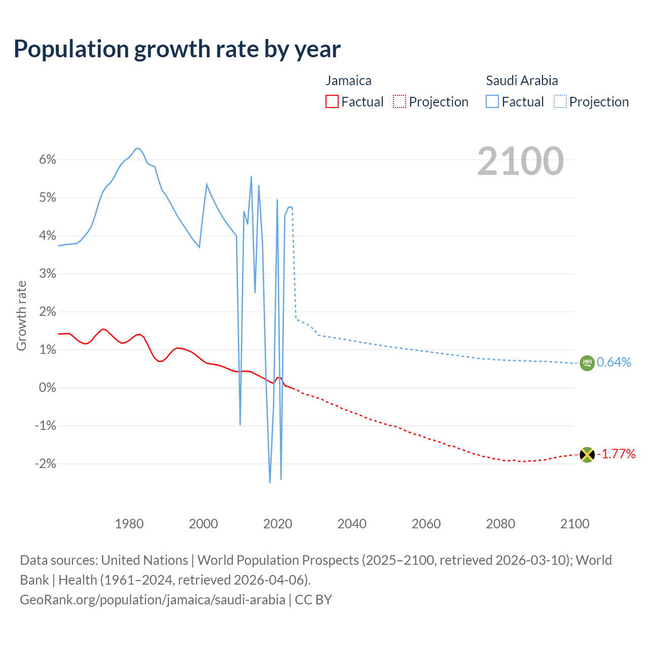 - For the last 10 years, Jamaica has had an average growth rate of +0.18% per year vs +2.3% in Saudi Arabia.