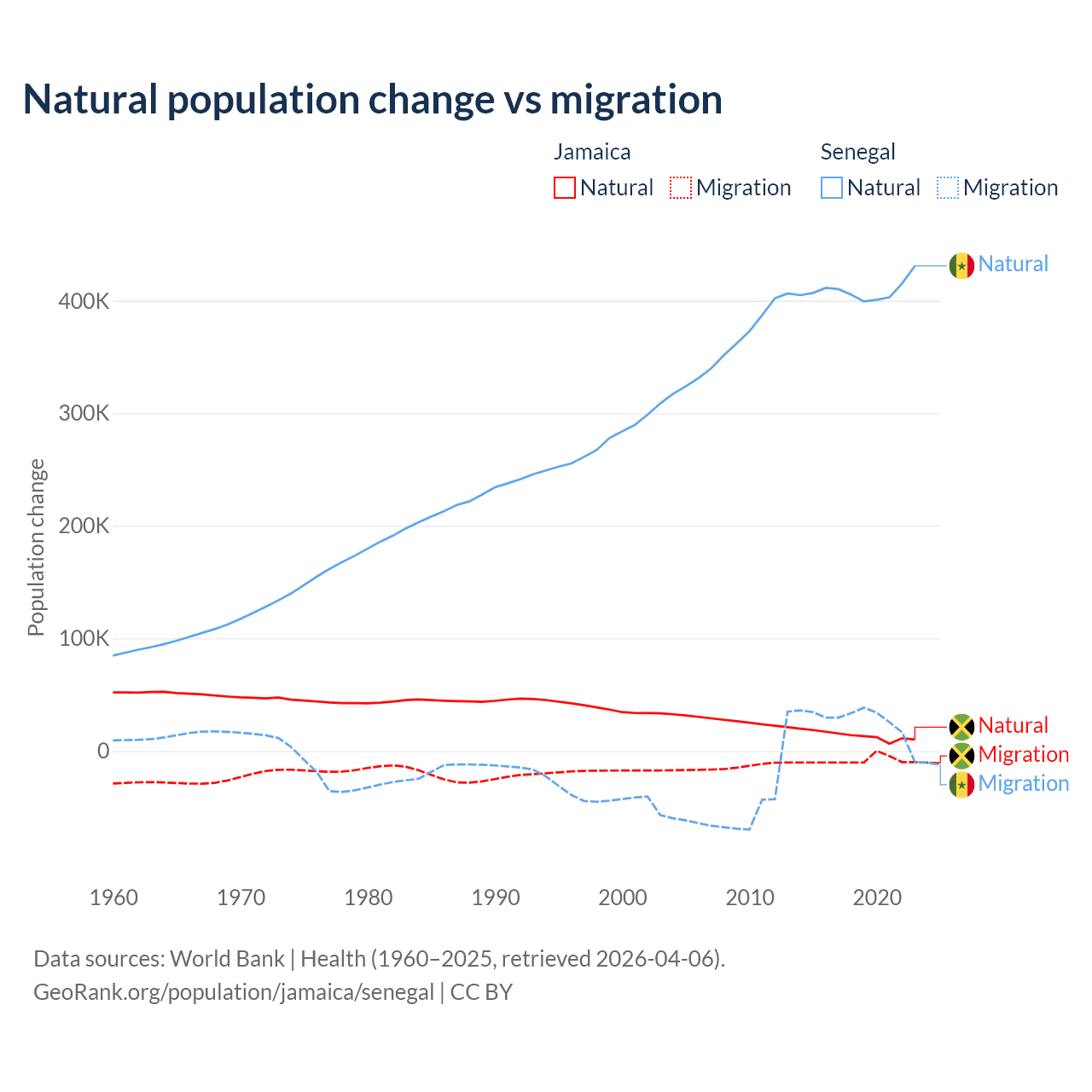 Over the last 10 years, 61.3% of the population change in Jamaica is from natural causes (a gain of 137,465 people) and 38.7% is from migration (a loss of 86,681 people). In Senegal 93.9% is from natural causes (a gain of 4,089,205 people) and 6.13% is from migration (a gain of 267,266 people).