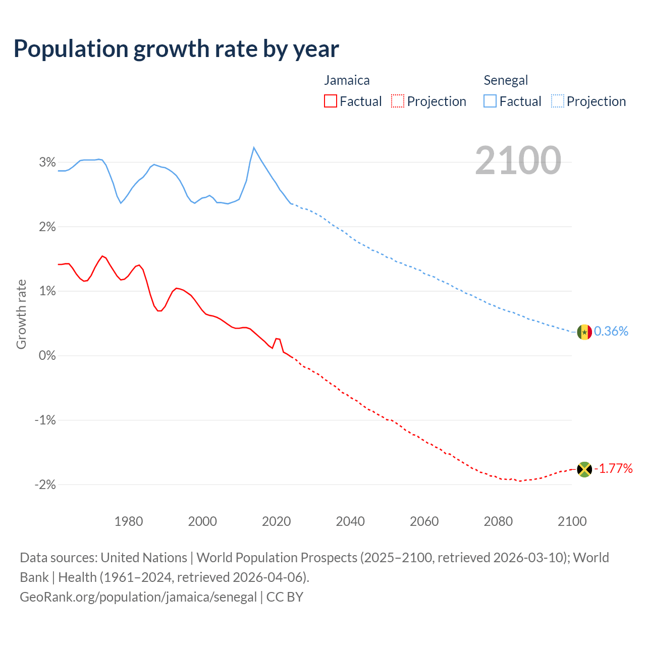 - For the last 10 years, Jamaica has had an average growth rate of +0.18% per year vs +2.76% in Senegal.