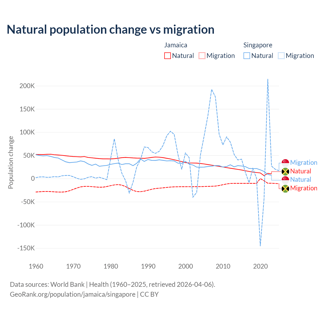 Over the last 10 years, 61.3% of the population change in Jamaica is from natural causes (a gain of 137,465 people) and 38.7% is from migration (a loss of 86,681 people). In Singapore 54.8% is from natural causes (a gain of 195,953 people) and 45.2% is from migration (a gain of 161,805 people).