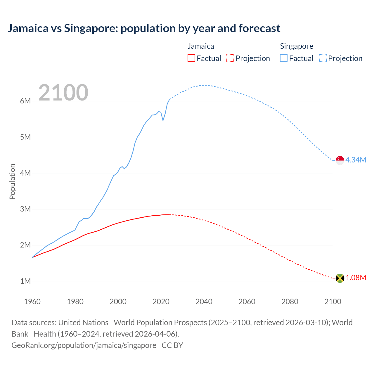 The latest officially reported population of Jamaica was 2,839,175 in 2024 vs 6,036,860 people in Singapore in 2024. In 2026, based on the adjusted UN estimation, the current Jamaica's population is 2,834,980 people compared to 6,125,852 in Singapore.