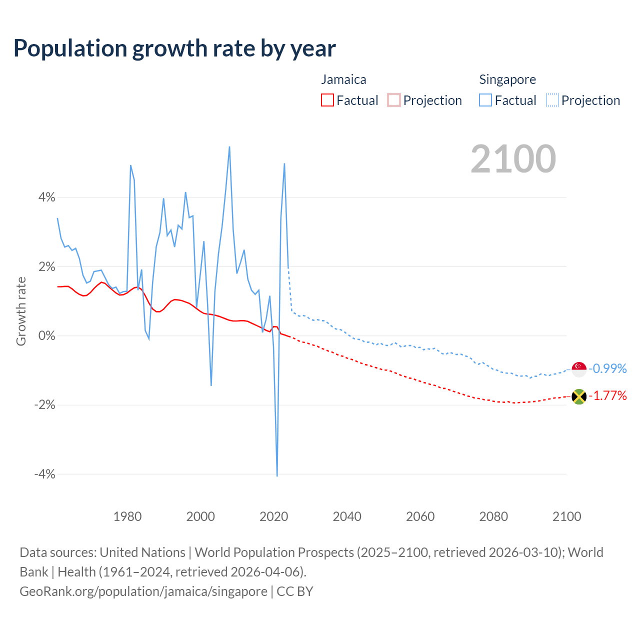 - For the last 10 years, Jamaica has had an average growth rate of +0.18% per year vs +1.04% in Singapore.