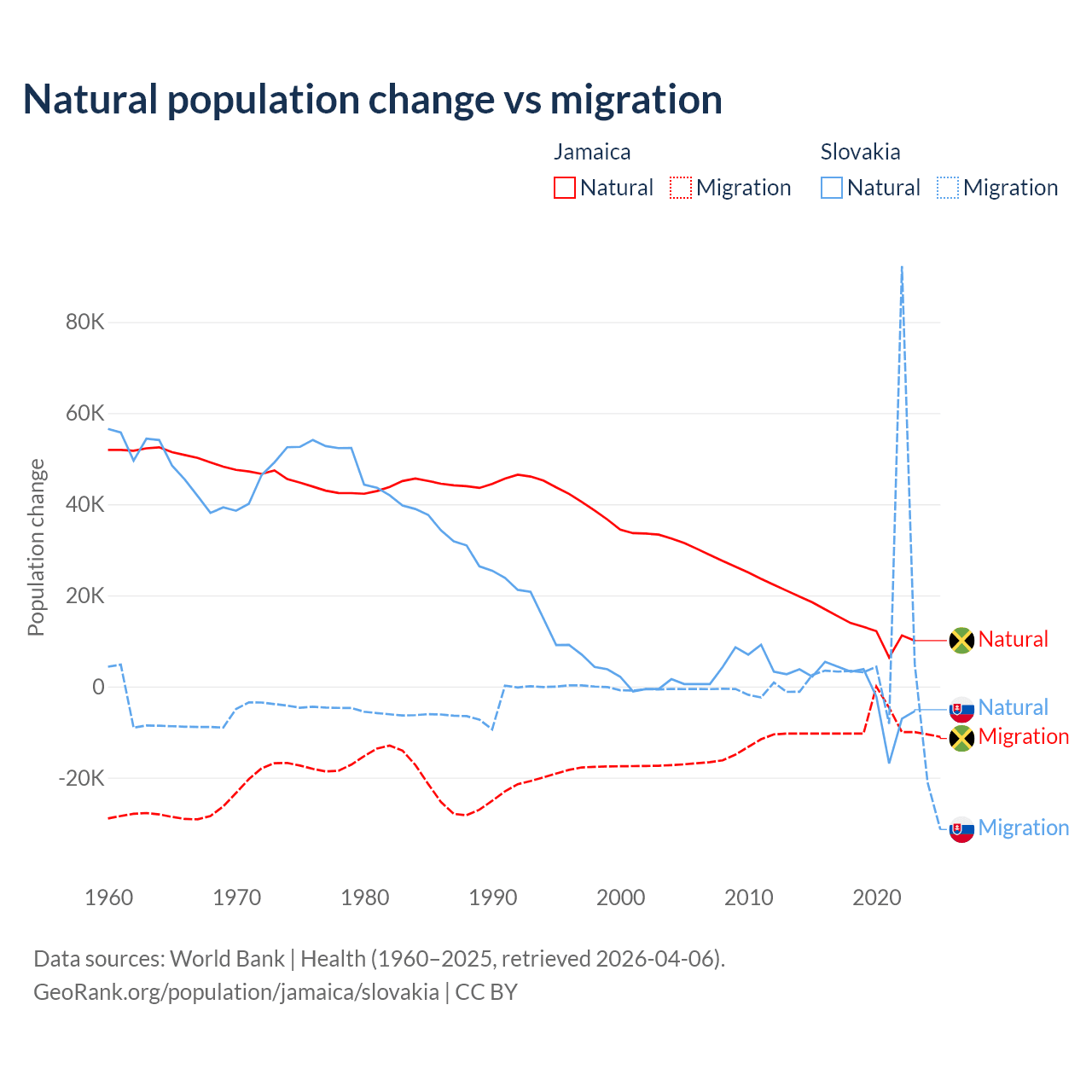 Over the last 10 years, 61.3% of the population change in Jamaica is from natural causes (a gain of 137,465 people) and 38.7% is from migration (a loss of 86,681 people). In Slovakia 7.47% is from natural causes (a loss of 8,728 people) and 92.5% is from migration (a gain of 108,156 people).