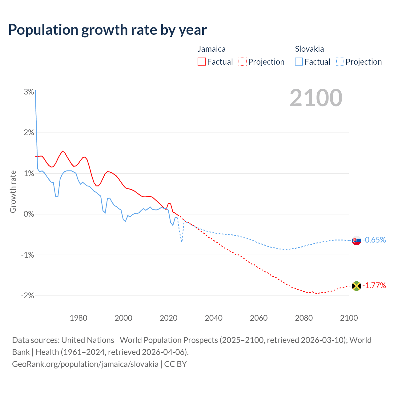 - For the last 10 years, Jamaica has had an average growth rate of +0.18% per year vs +0.01% in Slovakia.