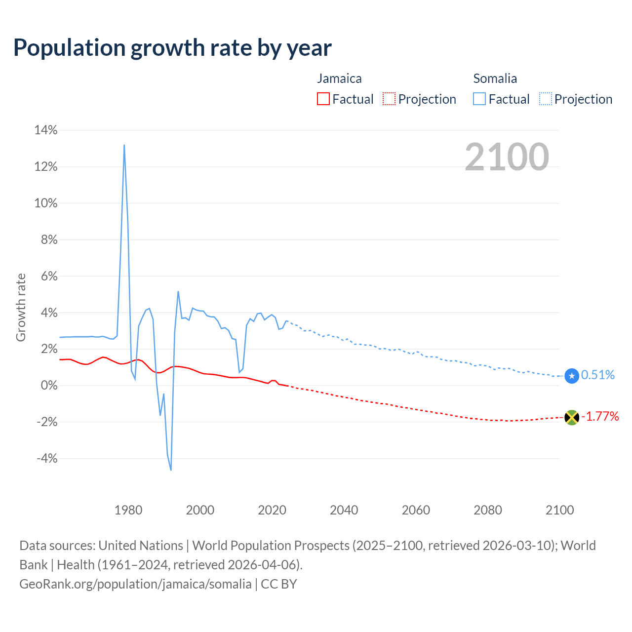 - For the last 10 years, Jamaica has had an average growth rate of +0.18% per year vs +3.61% in Somalia.